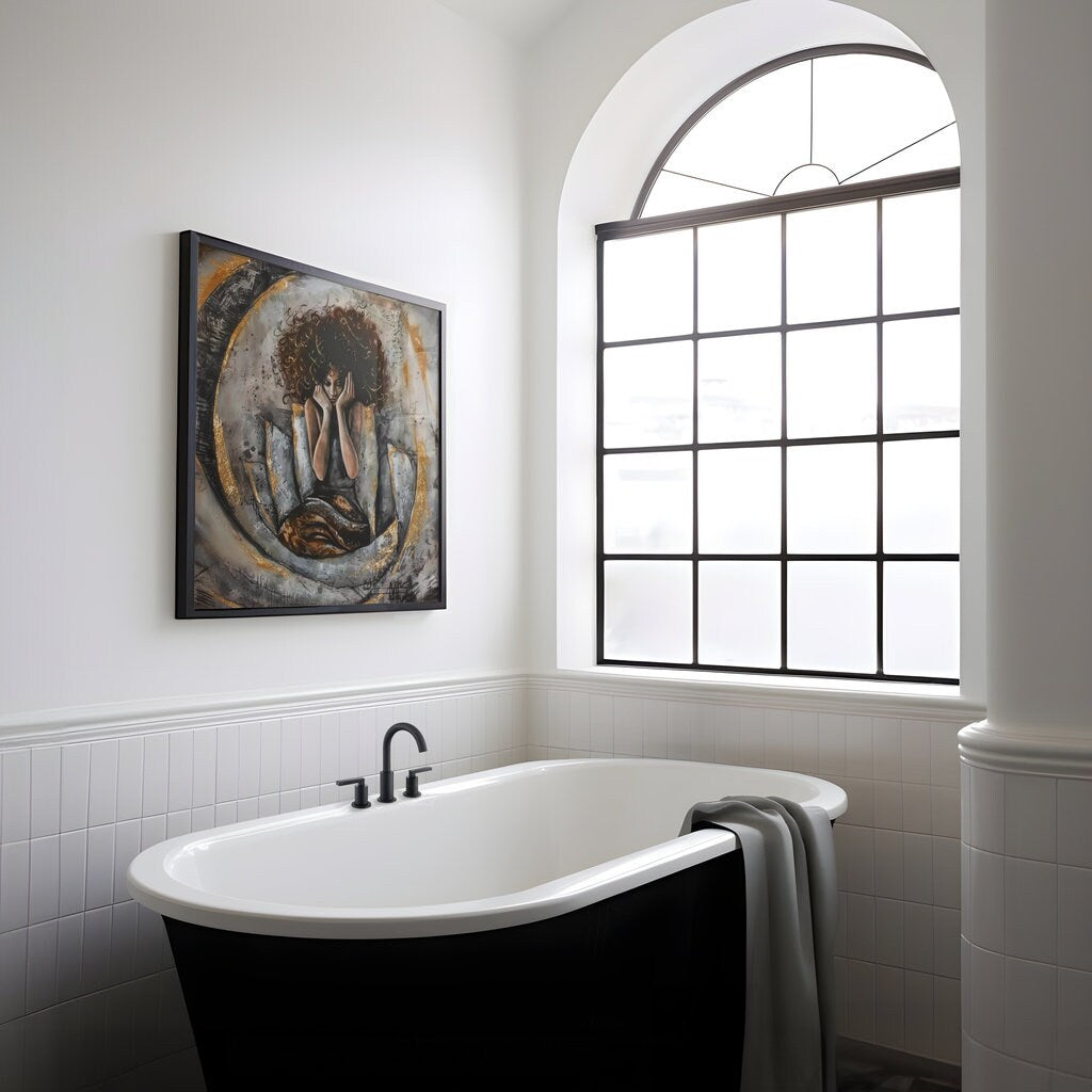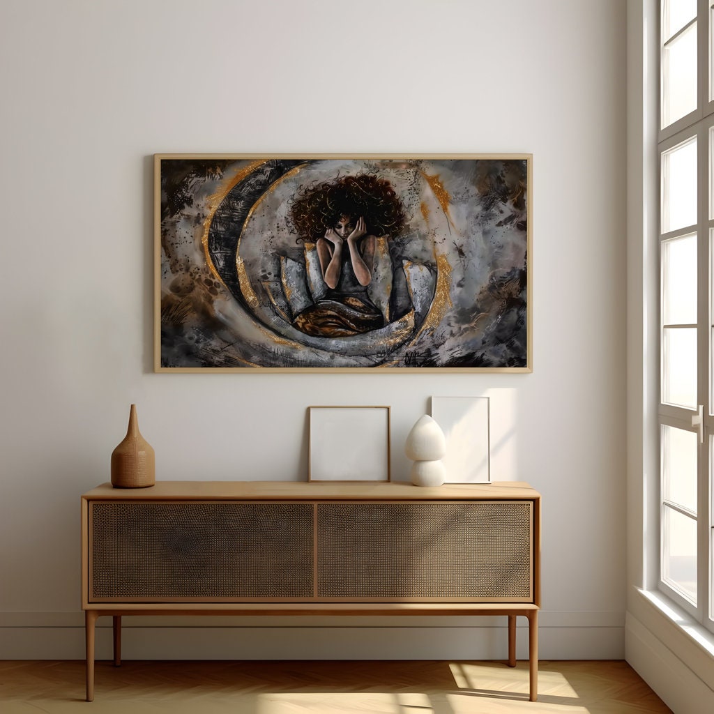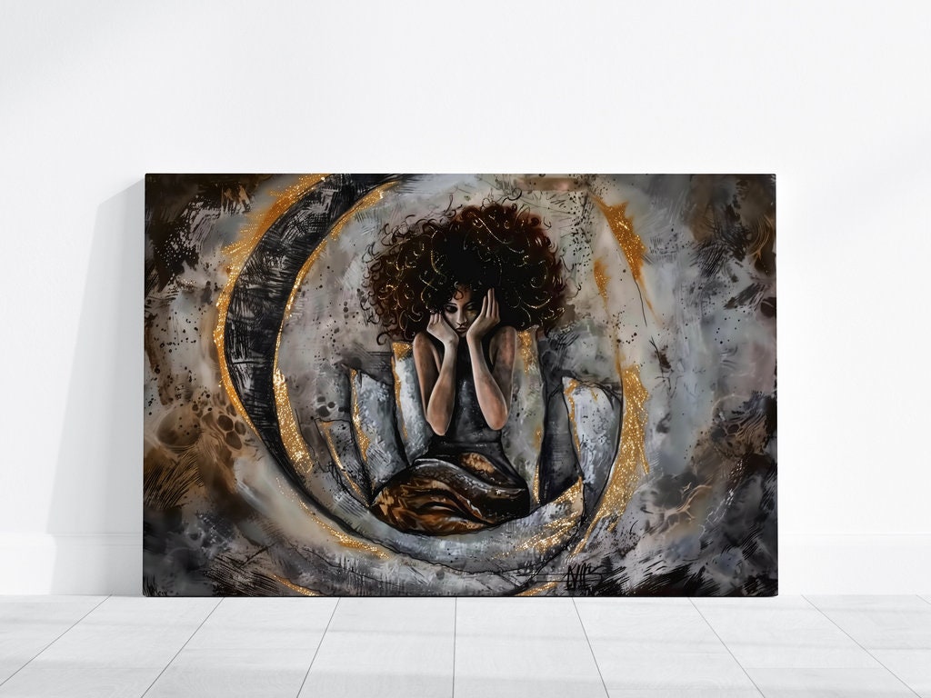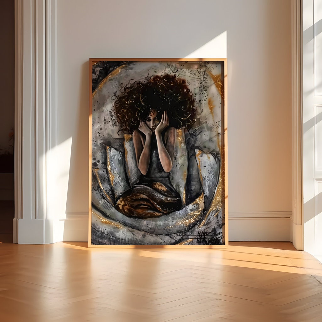 Journey into the profound, quiet center of the self with βThe Golden Self,β a stunning and evocative portrait that captures a moment of deep, meditative peace. This artwork features a woman with curly dark hair, her serene, pensive expression a sign of a rich inner world, surrounded by a swirling, ethereal background adorned with touches of gold. Praised by our collectors for its "dreamlike, mystical quality" and "captivating, dramatic composition," this piece is a perfect tribute to the beautiful, complex, and powerful landscape of the inner world.