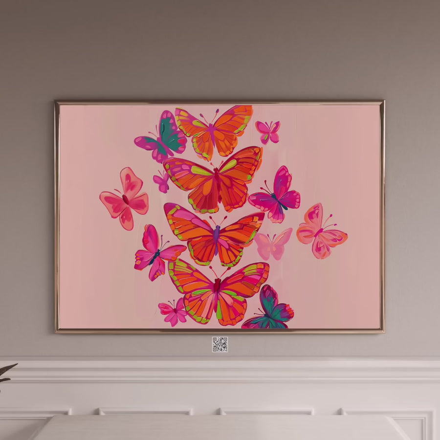 A Burst of Cheerful Energy: A whimsical pink and orange butterfly, rendered in a funky, maximalist style, creates a composition that admirers call "a perfect spark of joy and conversation."