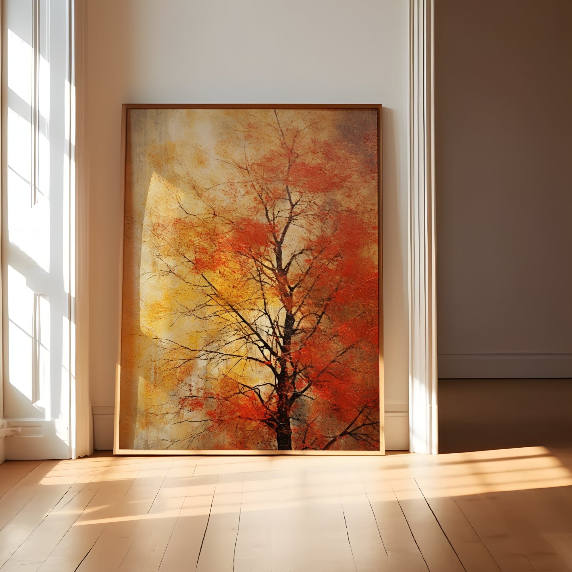 • A Dance of Vibrant Color: Expressive brushstrokes of red, yellow, and orange depict a tree's graceful transformation, creating a composition that admirers call "a radiant and transient masterpiece."