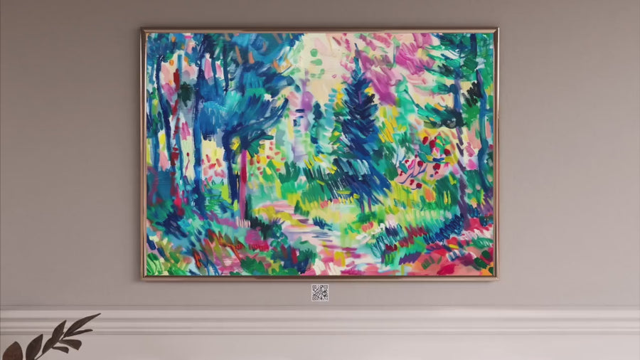 • A Living Forest: Your artwork includes a unique QR code. When scanned, the leaves on the trees may rustle or the light may dapple on the path, bringing this vibrant, interactive forest journey to life.