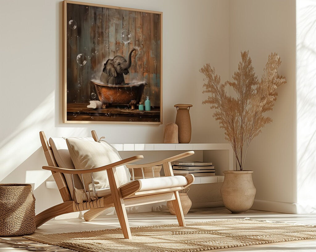 The Little Bather: Surreal Baby Elephant in Bubble Bath | Whimsical & Rustic Bathroom Art