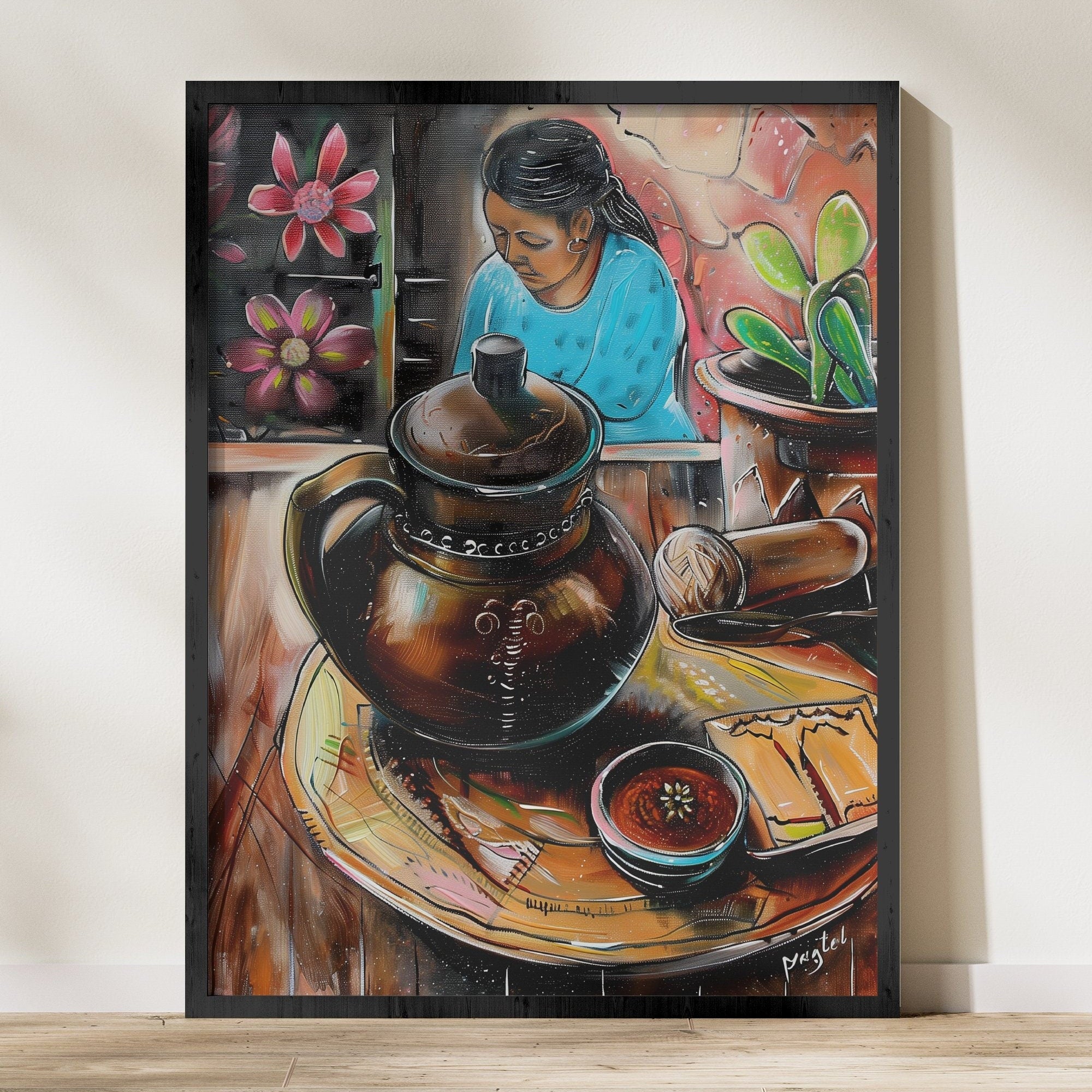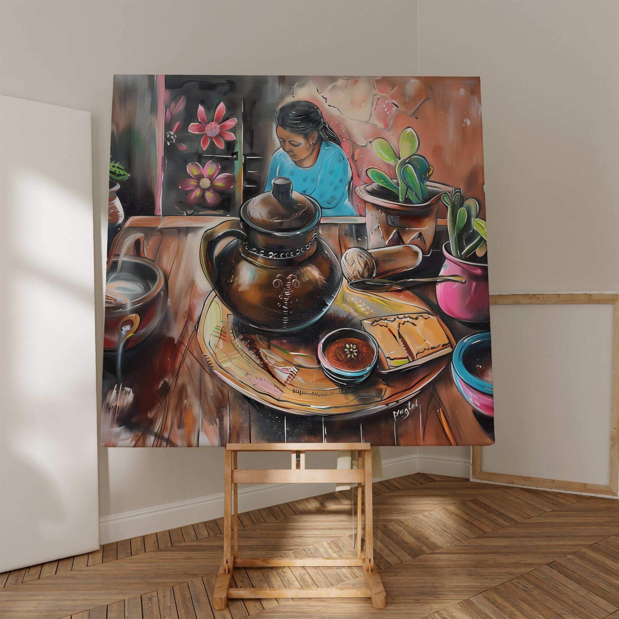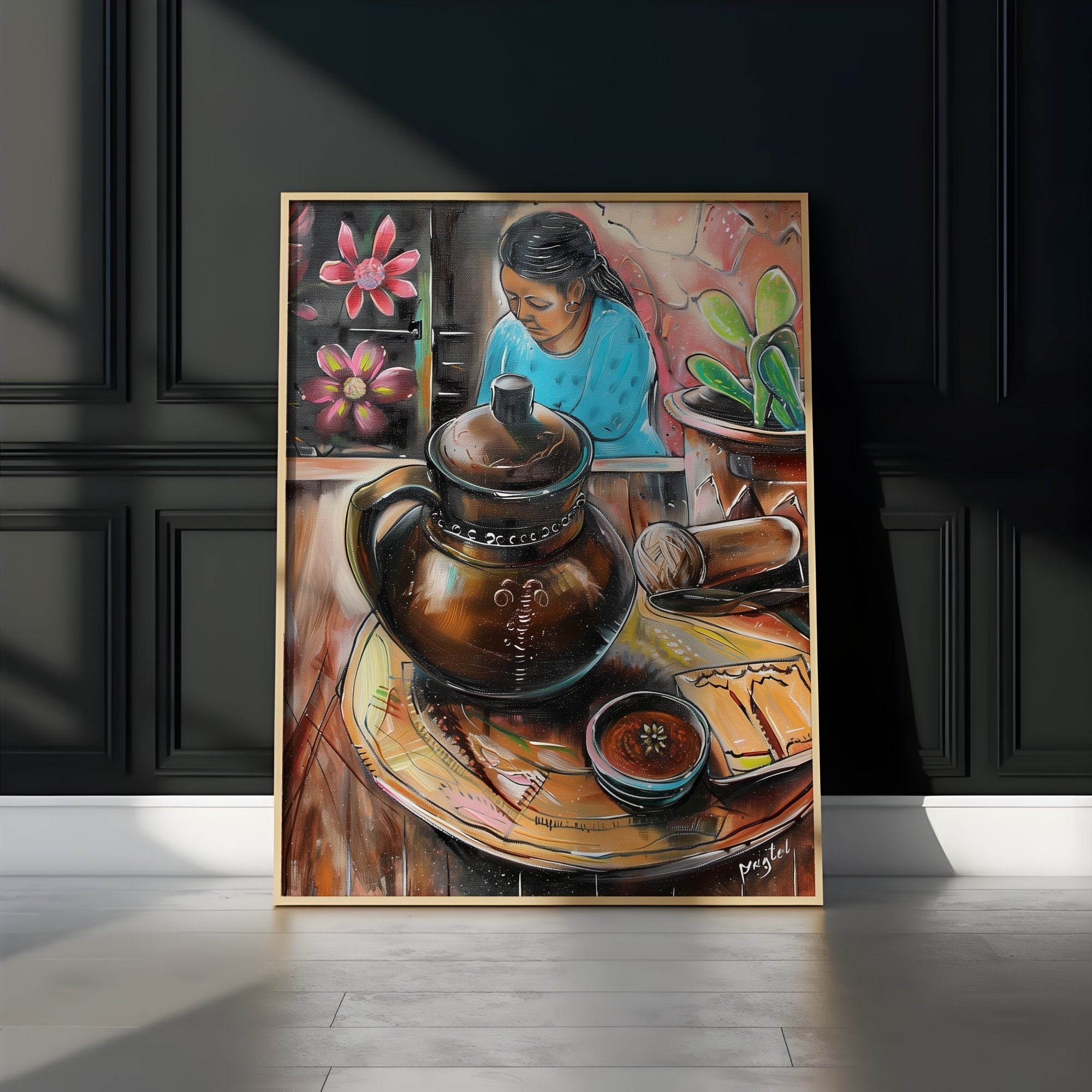 This artwork is a beautiful and soulful meditation on the power of a shared ritual. The Cafe de Olla, brewed in a communal pot with cinnamon and piloncillo, is more than just a drink; it is the warm, sweet, and spiced centerpiece of a shared experience. It represents the comfort of community, the easy flow of conversation, and the simple, profound pleasure of starting the day together. To live with this piece is to be reminded of the deep, nourishing comfort that comes from our shared cultural traditions and the quiet, beautiful moments that connect us to one another.