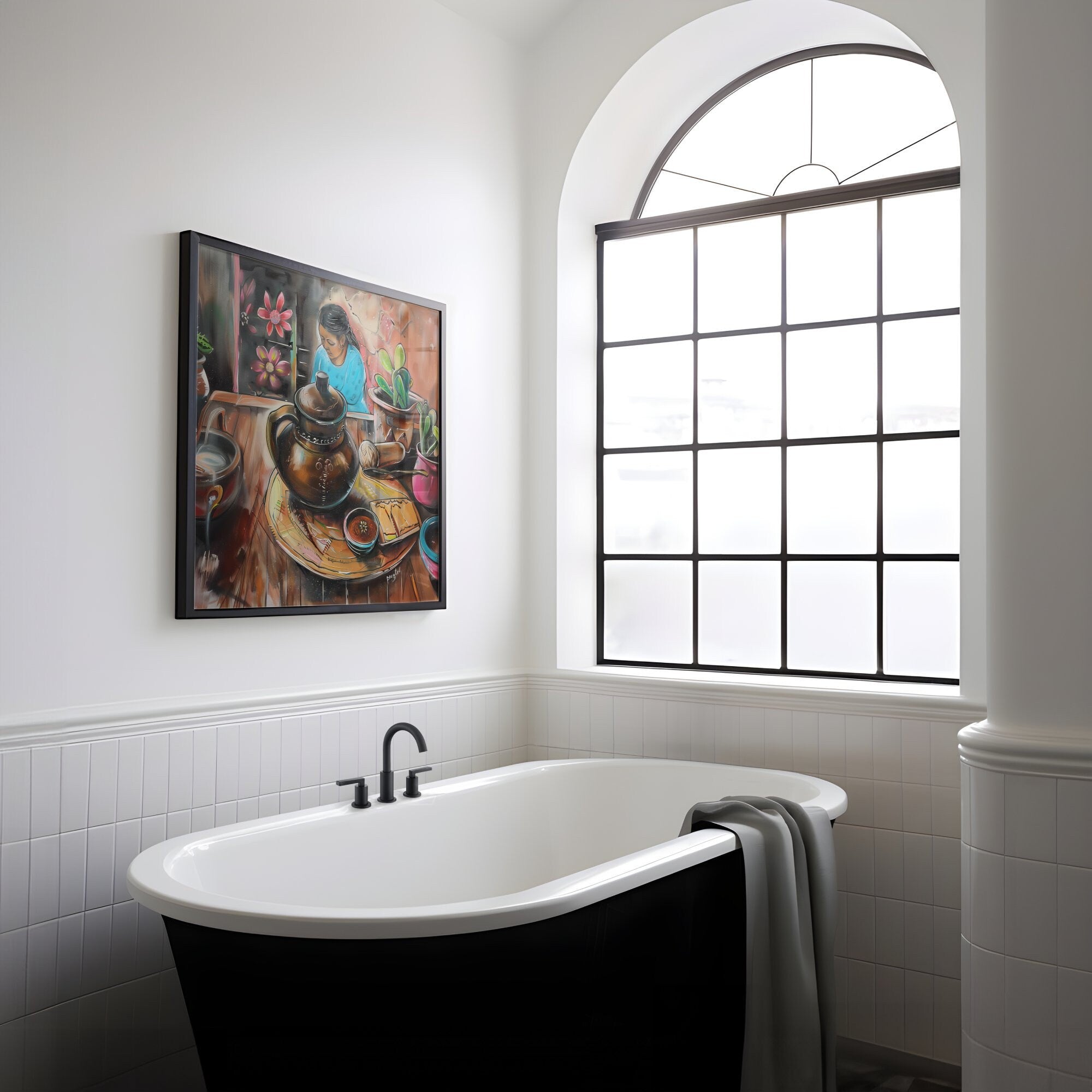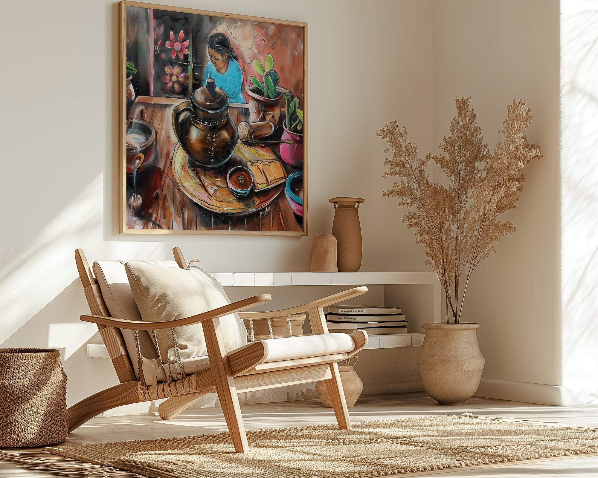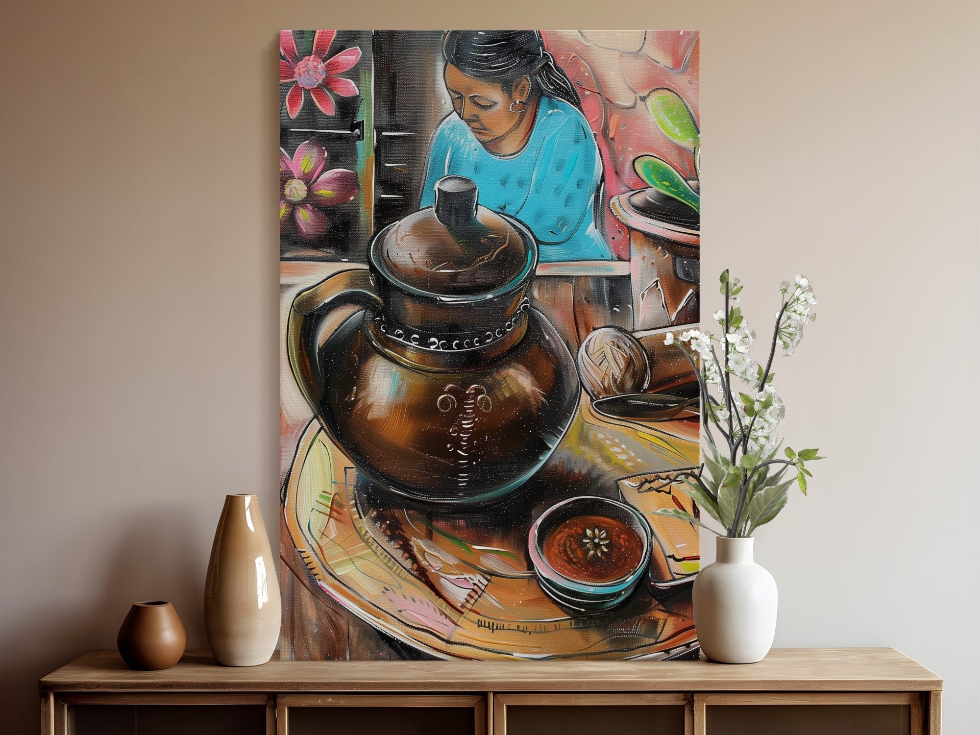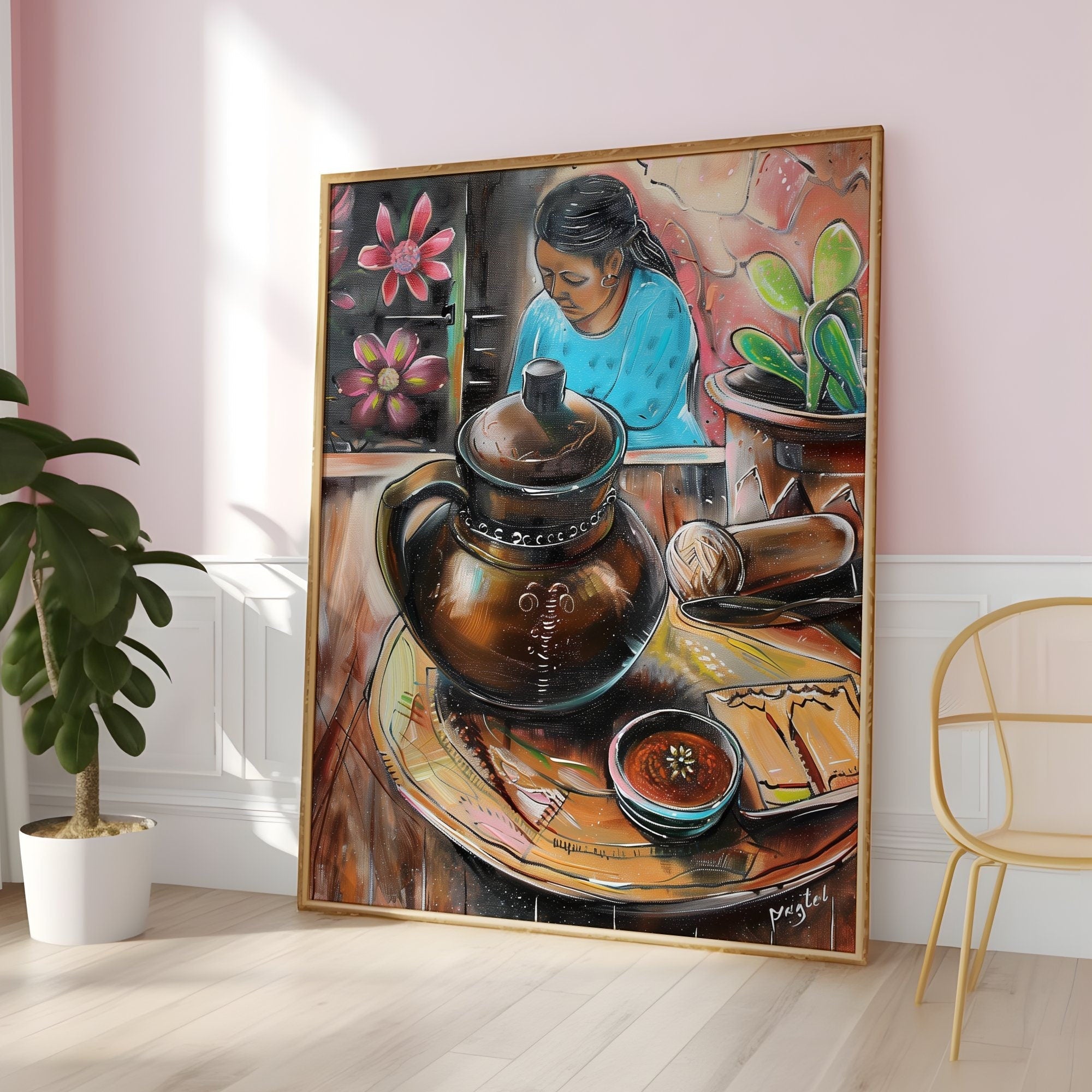 This artwork is a beautiful and soulful meditation on the power of a shared ritual. The Cafe de Olla, brewed in a communal pot with cinnamon and piloncillo, is more than just a drink; it is the warm, sweet, and spiced centerpiece of a shared experience. It represents the comfort of community, the easy flow of conversation, and the simple, profound pleasure of starting the day together. To live with this piece is to be reminded of the deep, nourishing comfort that comes from our shared cultural traditions and the quiet, beautiful moments that connect us to one another.