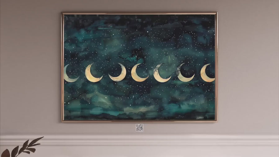 • A Living Cycle: Your artwork includes a unique QR code. When scanned, the moon may slowly move through its phases across the starry night, bringing this beautiful, interactive celestial journey to life.