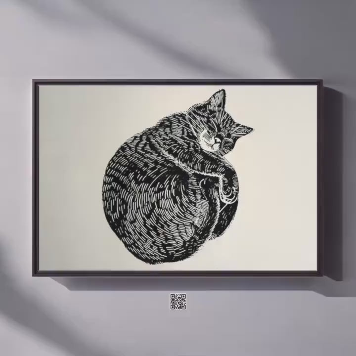 Find a moment of perfect peace with β€˜Cat Nap,’ a charming and original linocut artwork that celebrates the simple joy of a restful slumber. This whimsical illustration captures a serene cat, curled up in a state of absolute trust and tranquility. Praised by our customers for its "heartwarming charm" and "soothing presence," this piece is a delightful touch for any space that cherishes warmth and quiet.
