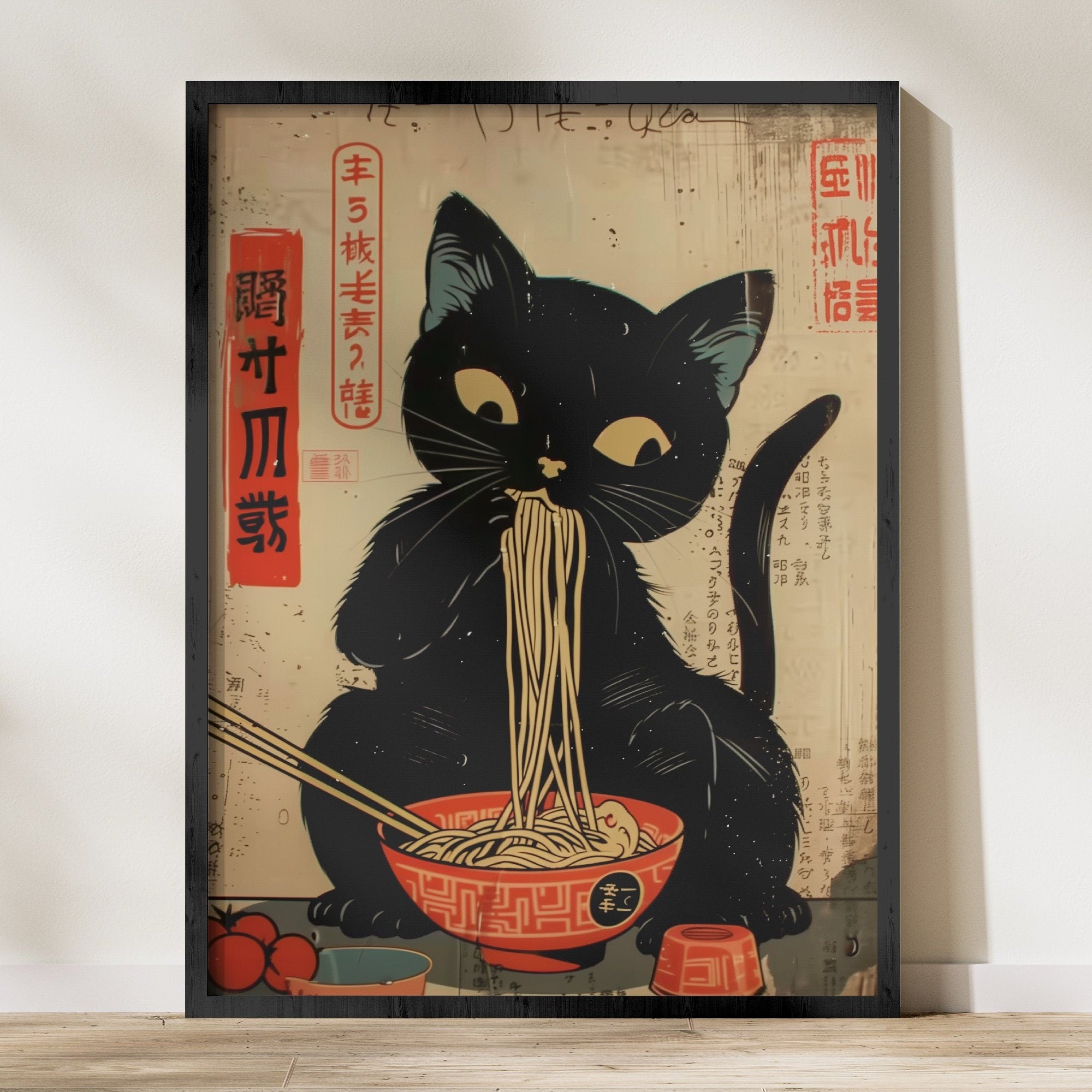 Step into a world where timeless tradition meets playful charm with ‘The Noodle Master,’ a captivating artwork that captures the serene, simple pleasure of a perfect meal. This piece features a sophisticated black cat, a picture of pure contentment, as it savors a bowl of ramen in a setting inspired by Japan’s Edo period. Praised by our collectors for its "cultural charm and playful elegance," this artwork is a perfect sanctuary of delight for any space.