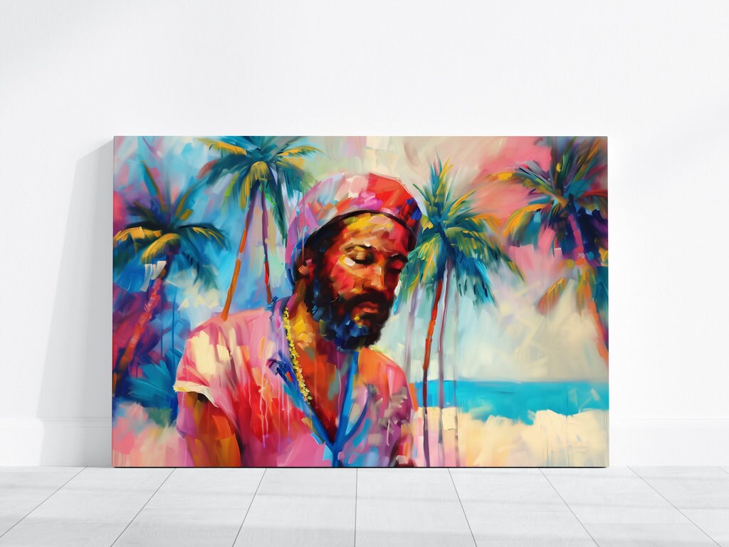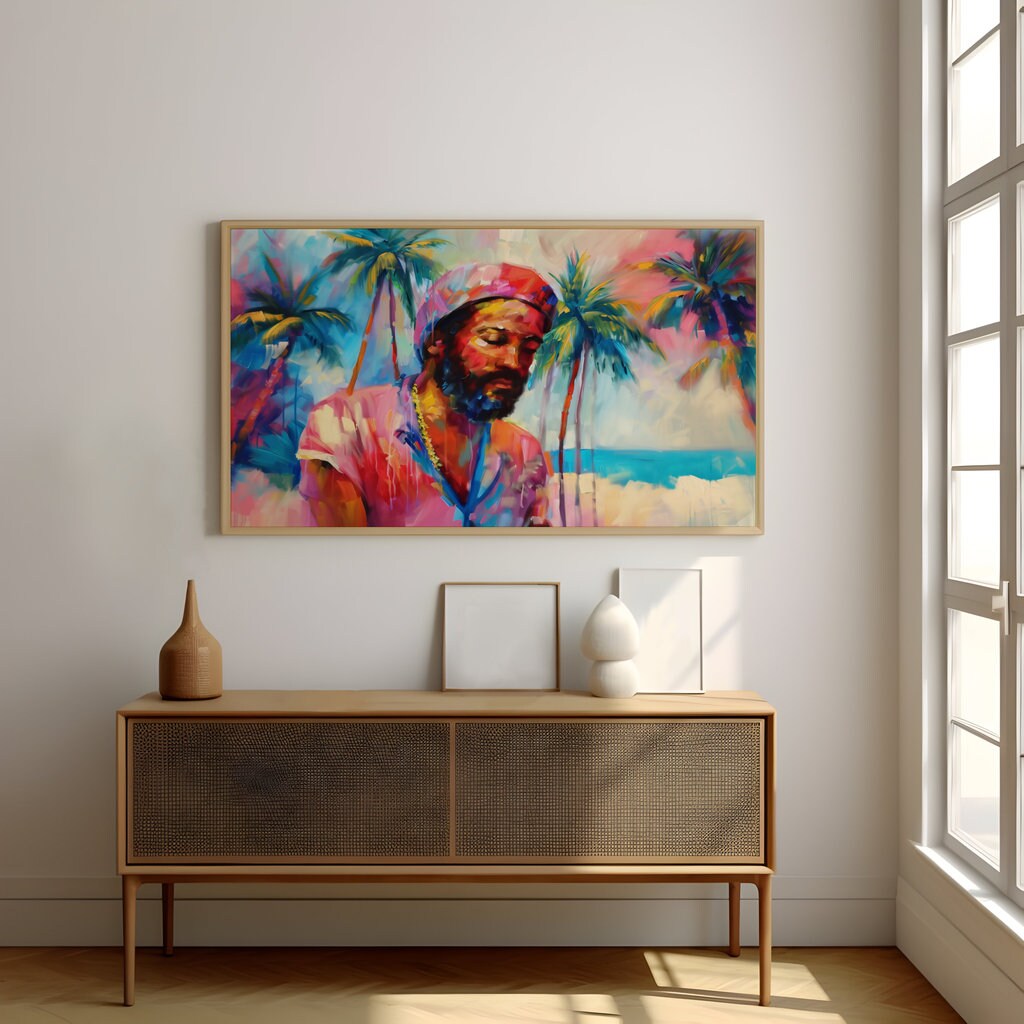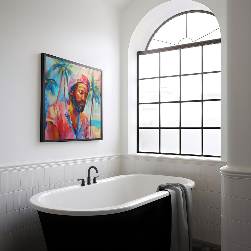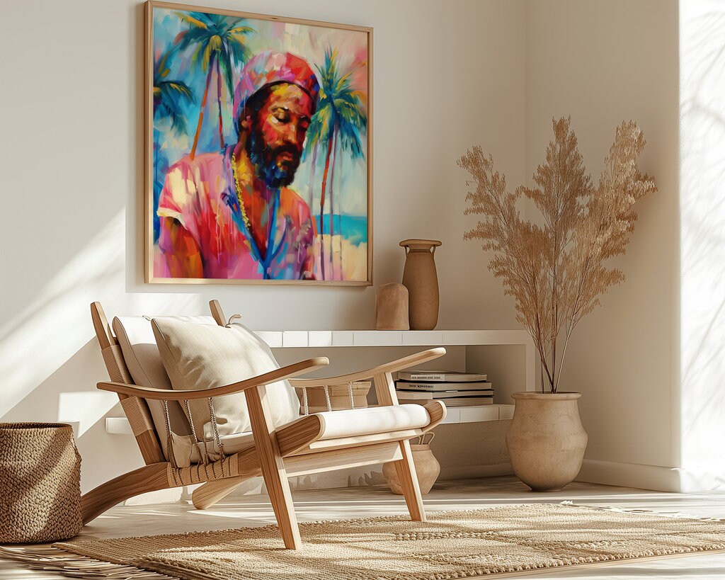• A Living Paradise: Your artwork includes a unique QR code. When scanned, the palm trees may sway or the colors on the man's face subtly shift, bringing this interactive, blissful moment to life.