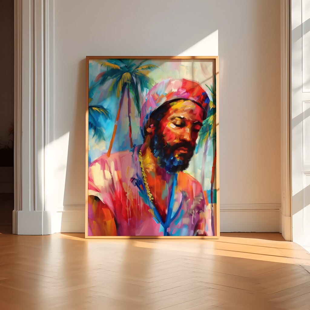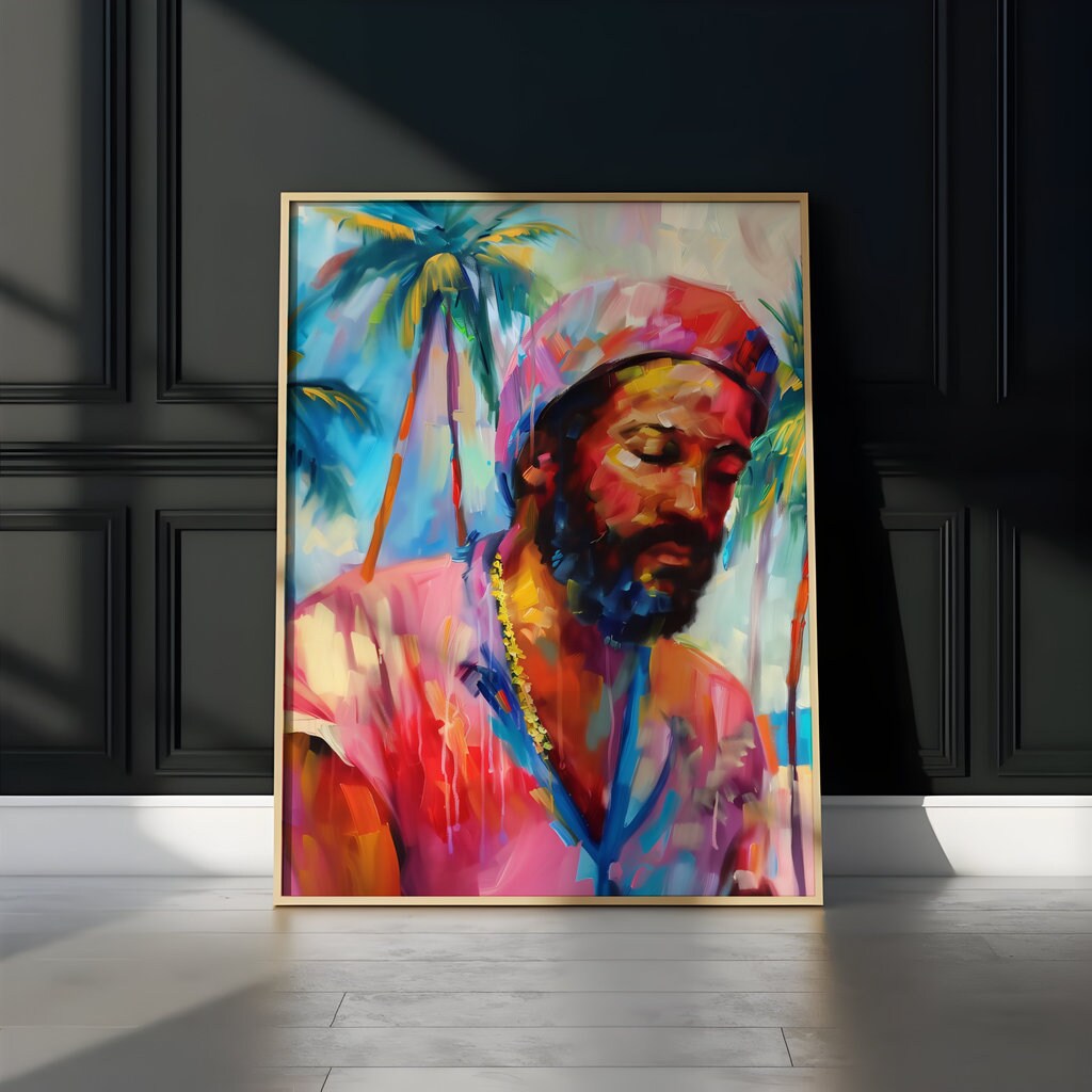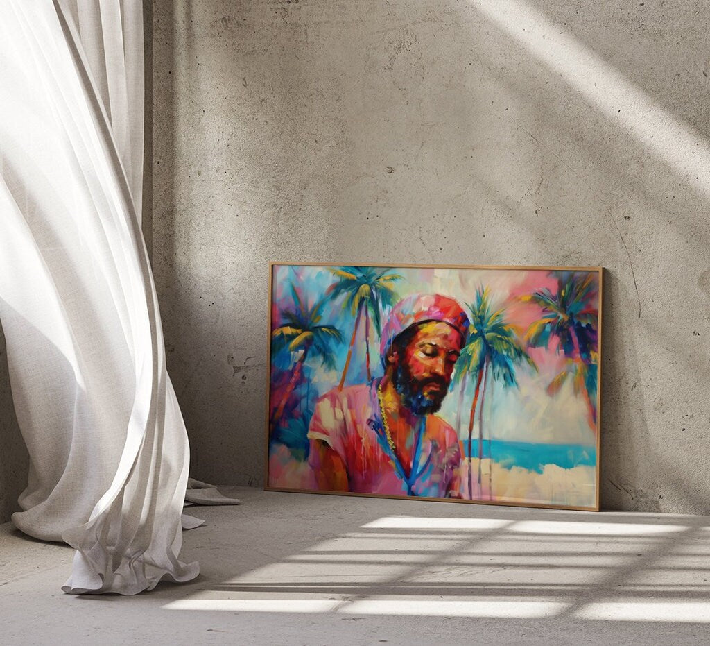 • A Living Paradise: Your artwork includes a unique QR code. When scanned, the palm trees may sway or the colors on the man's face subtly shift, bringing this interactive, blissful moment to life.
