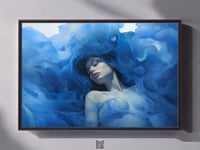 A Living Metamorphosis: Your artwork includes a unique QR code. When scanned, the fractal shapes may gently swirl and expand or the woman's form may further dissolve into the blue, bringing this mystical, interactive transformation to life.