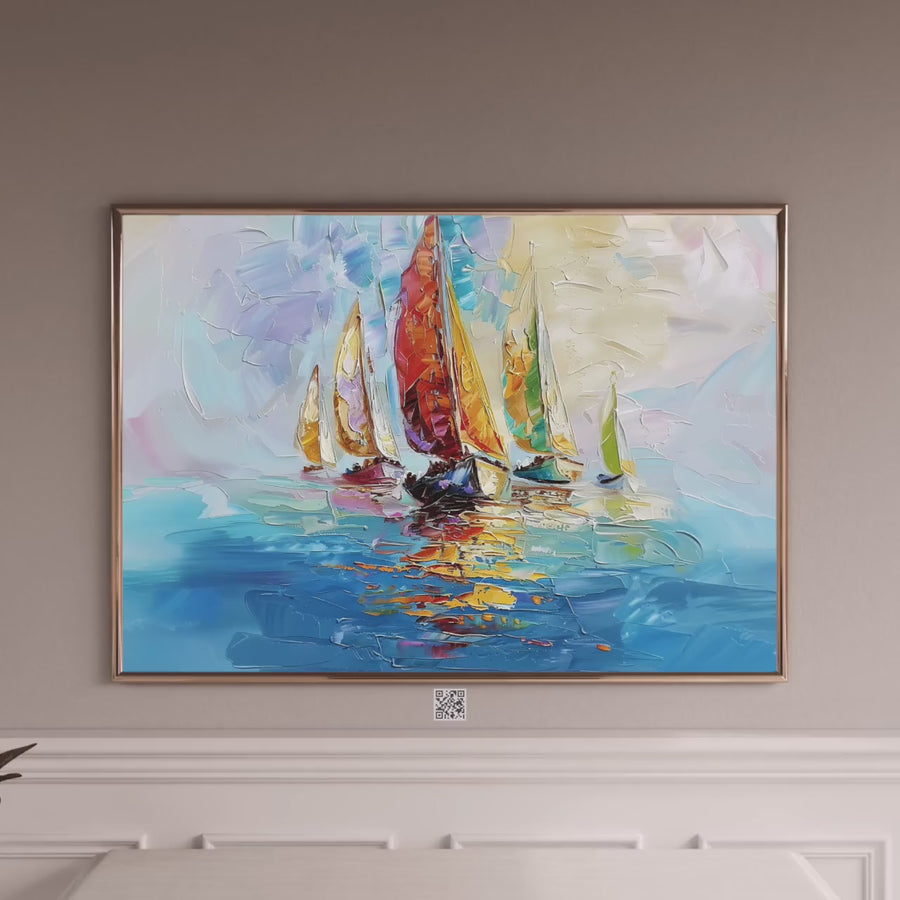 • A Living Harbor: Your artwork includes a unique QR code. When scanned, the sailboats may gently rock in the harbor or the golden textures may shimmer in the light, bringing this serene, interactive coastal scene to life.