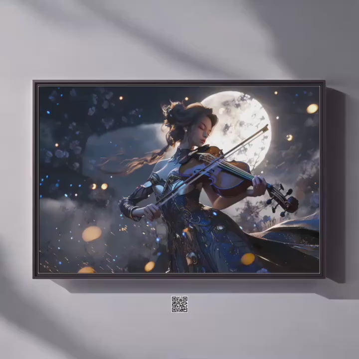 The moon has long been a symbol of our deepest intuitions and the quiet, mysterious world of the soul. The violin, played so close to the heart, gives that inner world a voice. This artwork captures the beautiful moment when the soul finds its song. The musician is not just performing; she is in a deep, private communion with the night, her music a bridge between her own heart and the vast, tranquil mystery of the cosmos. To live with this piece is to celebrate the romance of your own inner life and the serene beauty that unfolds when you listen closely to your own heart's music.