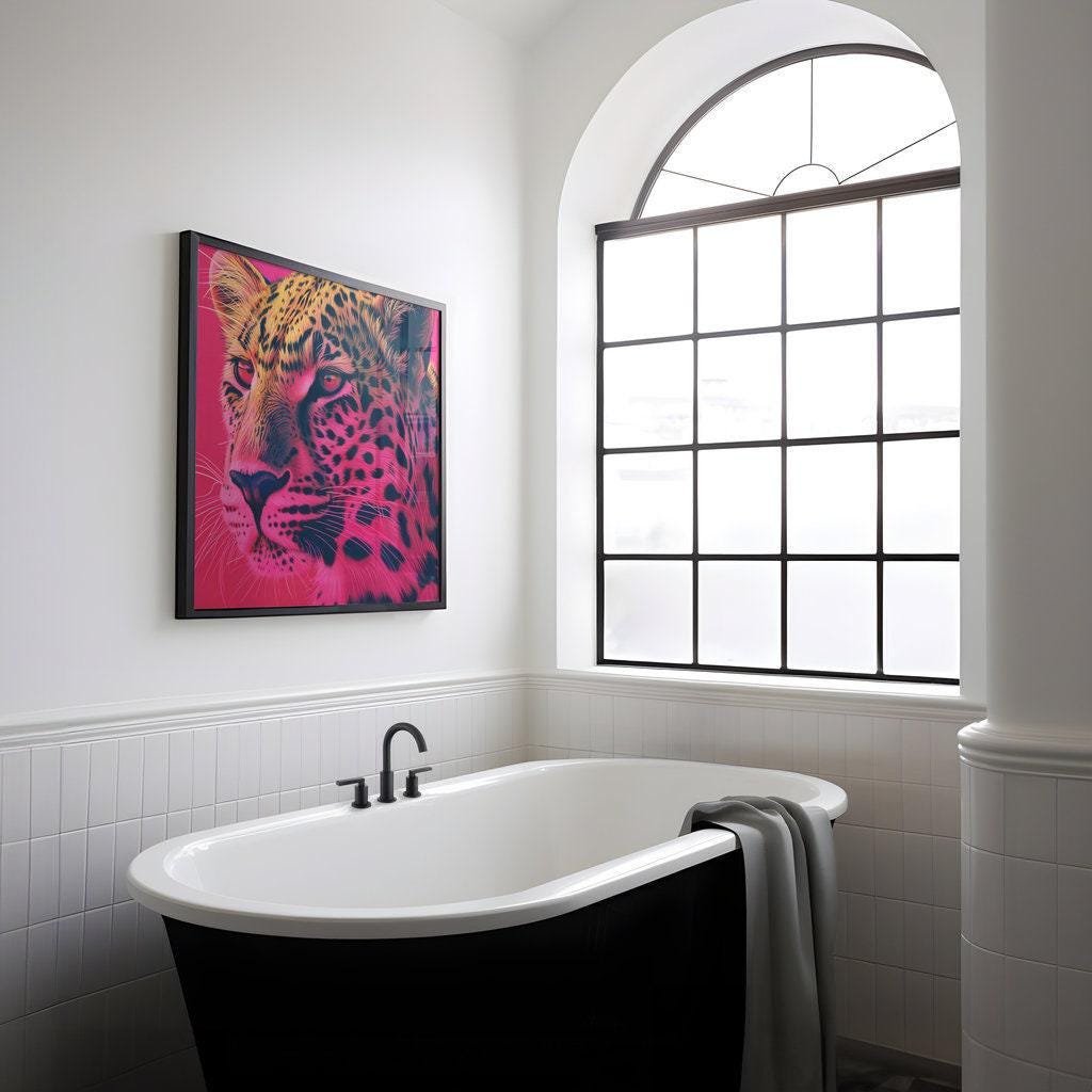 Command your space with the captivating presence of ‘The Regent,’ a stunning portrait that celebrates the fierce elegance of the majestic leopard. This artwork renders the animal in vibrant, saturated colors, its intense gaze and intricate fur patterns set against a dramatic pink background. Praised by our collectors for its "bold, regal energy" and "striking, modern style," this piece is a powerful tribute to the untamed beauty that reigns supreme.