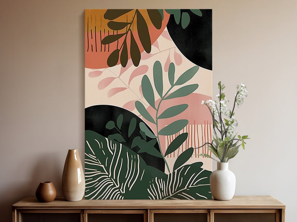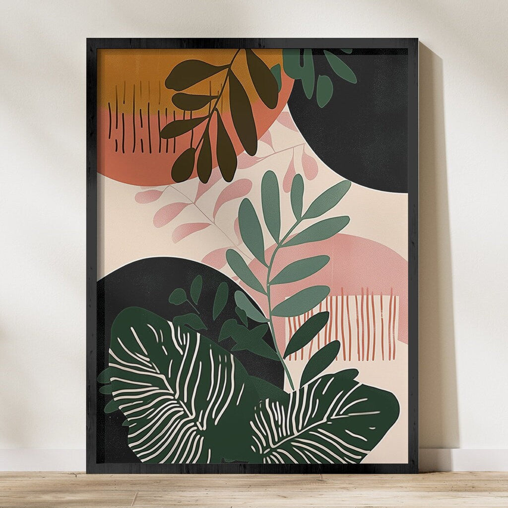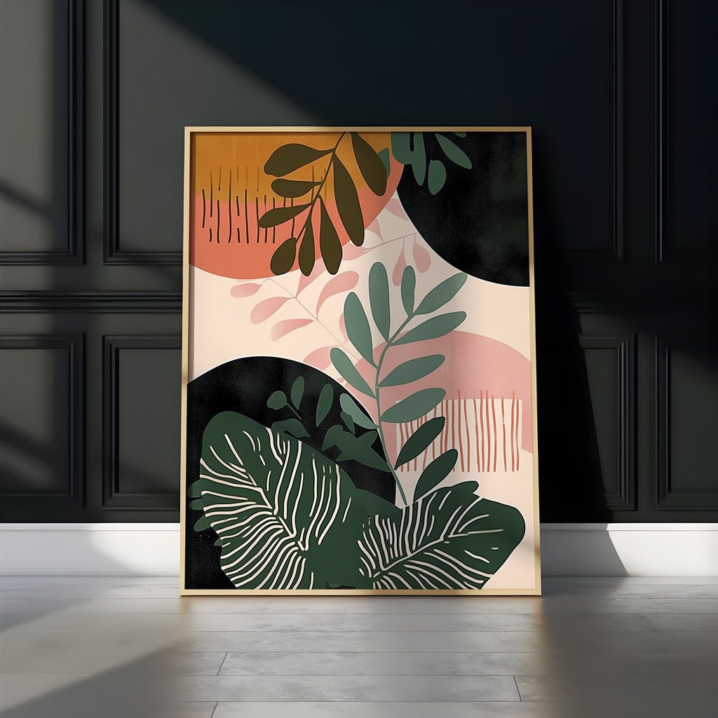 Bring the serene elegance of a tropical oasis into your home with ‘Tropical Tranquility,’ a sophisticated mid-century modern artwork that celebrates the beauty of natural forms. This piece features a carefully curated arrangement of abstract tropical leaves, blending their organic grace with the clean lines of modern design. Cherished by our collectors for its "soothing, inviting atmosphere" and "timeless, elegant aesthetic," this artwork is a perfect slice of paradise for any contemporary space.