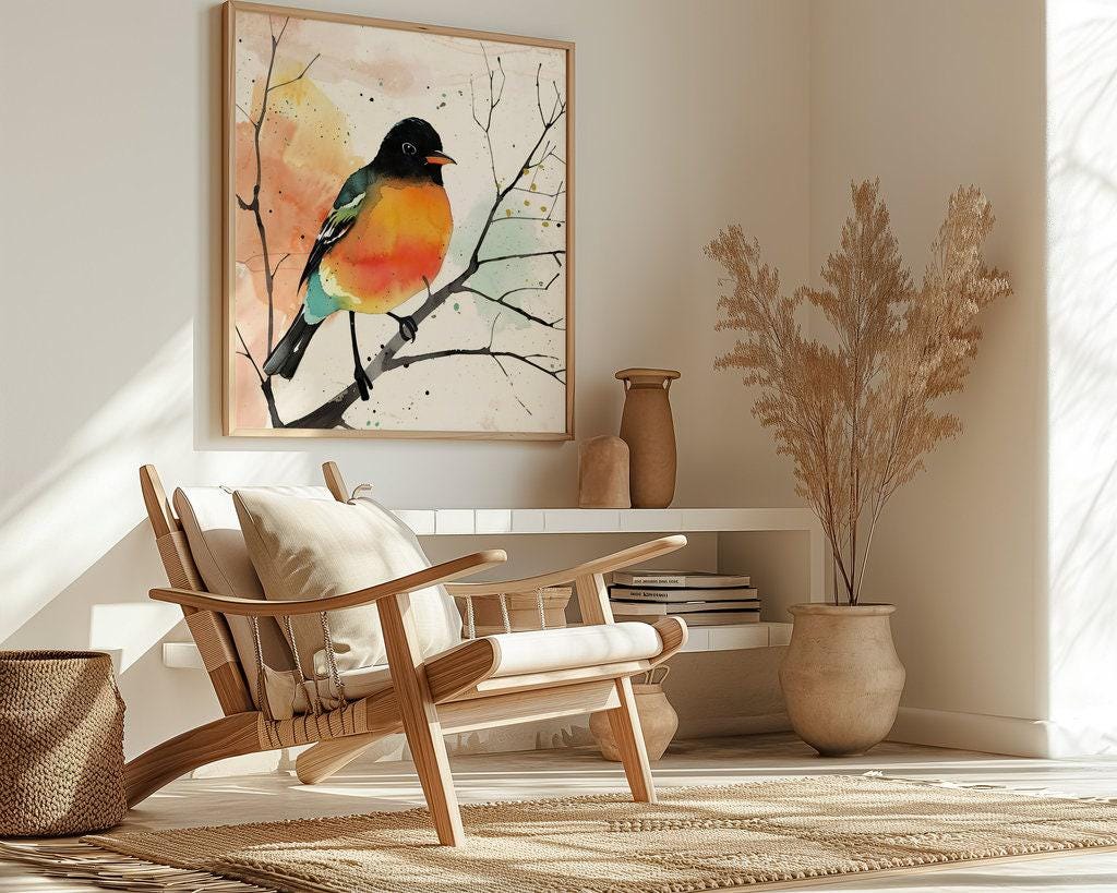 Let your spirit sing in full color with ‘The Soloist,’ a stunning watercolor painting that celebrates the beauty of a singular voice. This artwork captures a vibrant orange and black bird perched confidently on a branch, its vivid colors a striking contrast to the warm, abstract world of emotion swirling in the background. Praised by our collectors for its "expressive, joyful energy" and "gorgeous, artistic flair," this piece is a perfect tribute to the power of a unique and vibrant personality.