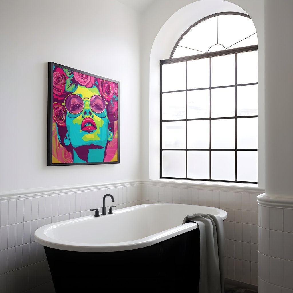 • A Living Diva: Your artwork includes a unique QR code. When scanned, the roses in her crown may bloom or her pink lips might give a subtle, confident smirk, bringing this vibrant, interactive pop art portrait to life.