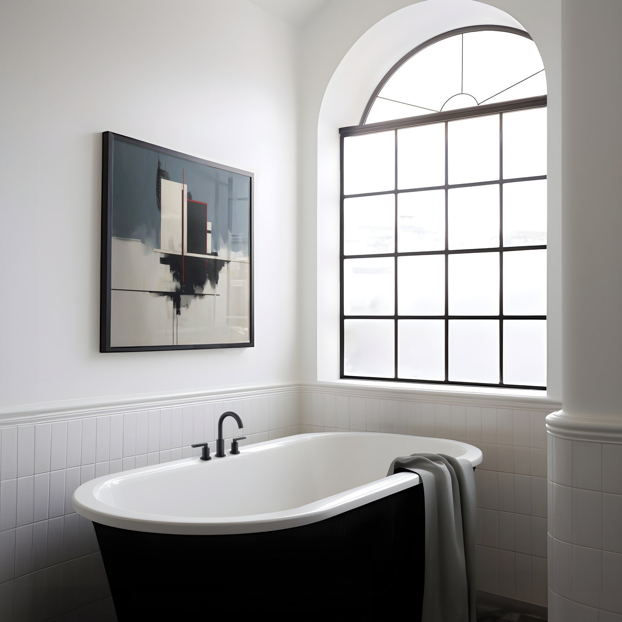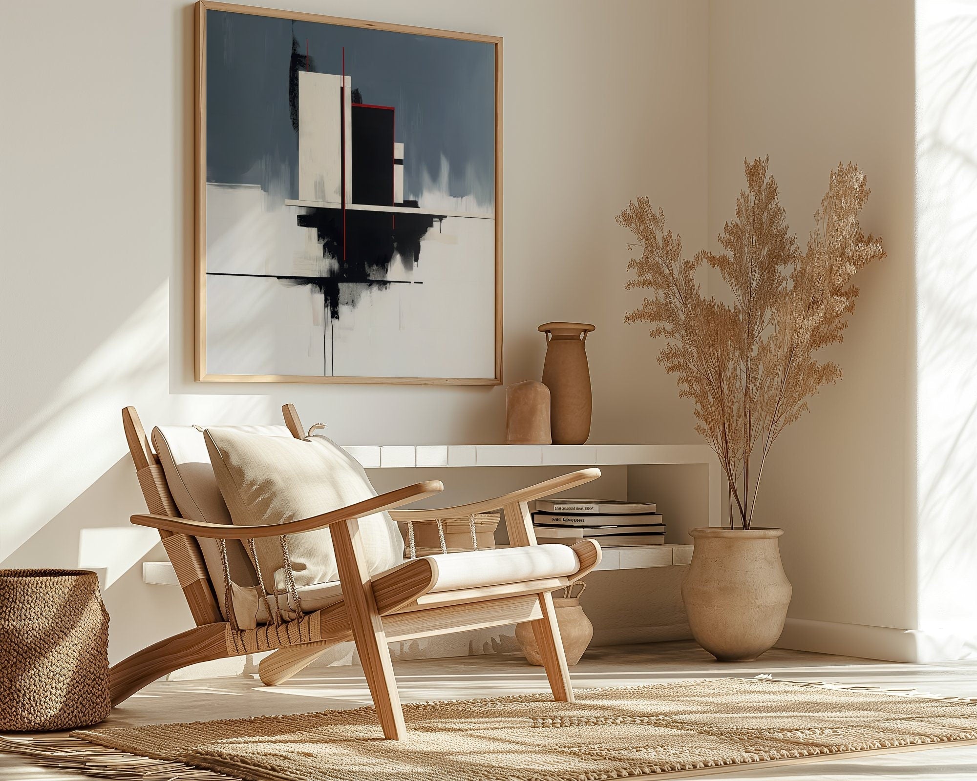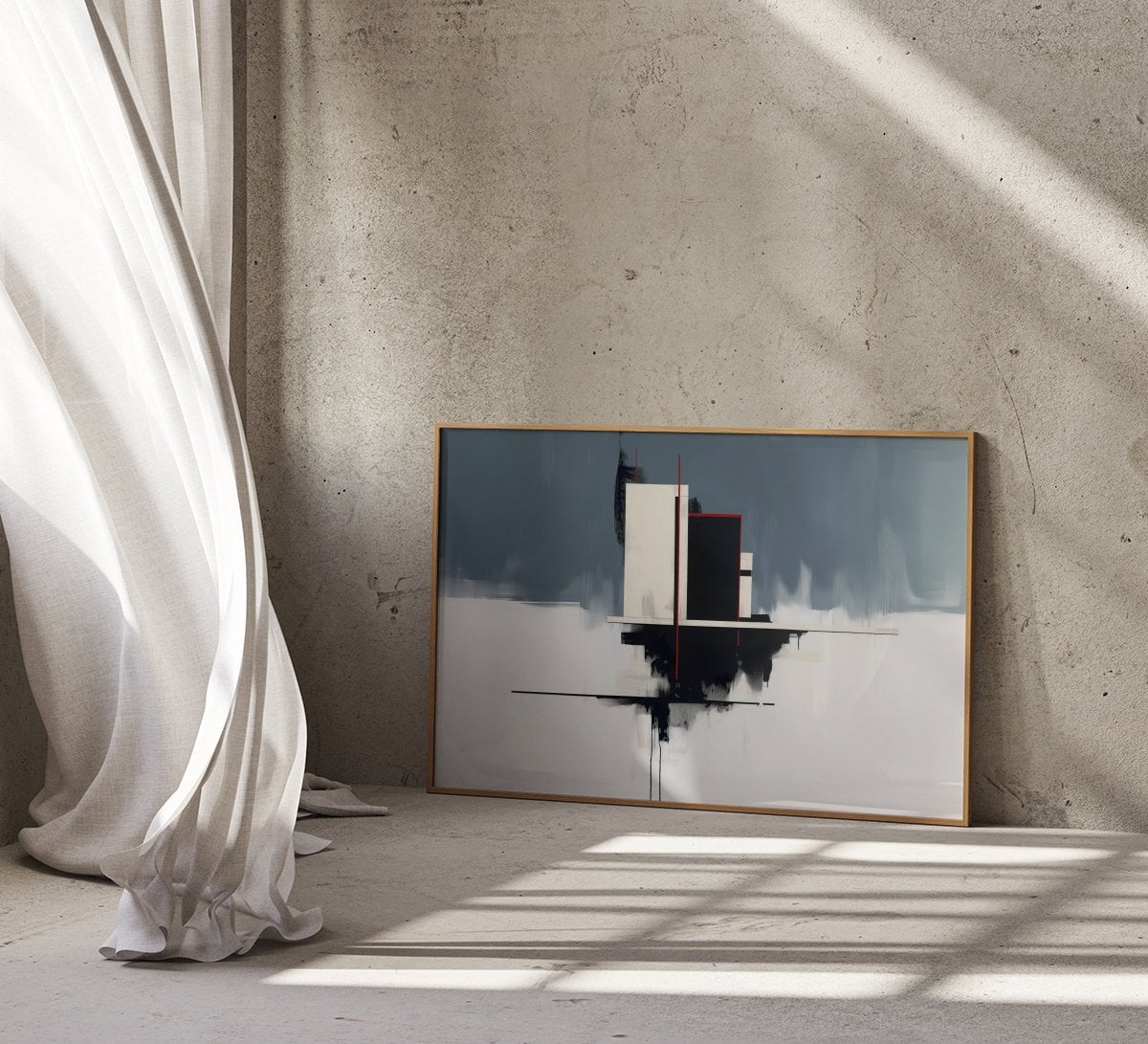 This artwork is a masterful portrait of a well-ordered and creative mind. The clean lines and balanced composition represent the beautiful, sophisticated structures we build in our livesβ€”our relationships, our careers, our very sense of self. The serene blue and clean white evoke a sense of calm, clarity, and rational thought, while the single, confident stroke of red is the spark of passion, the creative impulse, the vibrant life force that is perfectly and beautifully contained within that elegant structure. It is a powerful reminder that the most beautiful life is one that finds a perfect, harmonious balance between its intellectual and passionate selves.