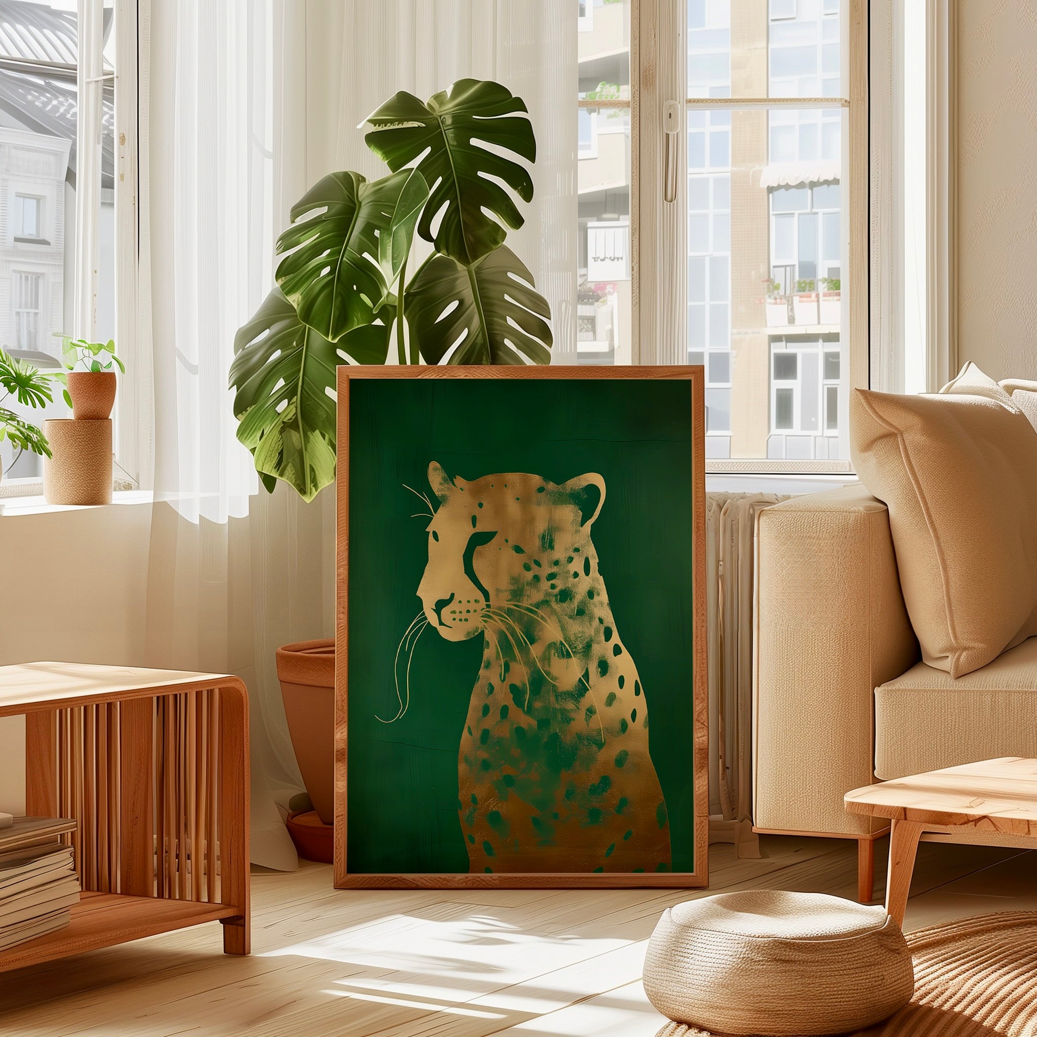 Unleash a world of opulent drama withย โ€˜The Emerald Leopard,โ€™ย a stunning artwork that blends the wild and the regal in a breathtaking statement of eclectic elegance.ย This captivating piece features a majestic leopard, its classic form reimagined in rich shades of emerald green and adorned with intricate gold patterns.ย Celebrated by our collectors for its "luxurious, maximalist vibe" and "fierce, graceful presence," this artwork is a perfect centerpiece for a home that is unapologetically bold.