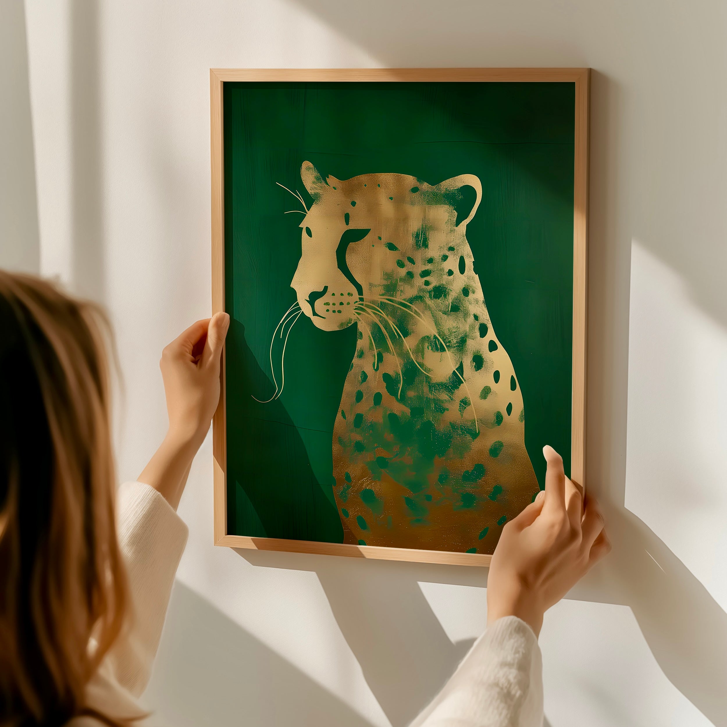 The leopard is a timeless symbol of instinctual grace and silent, confident power. In this artwork, that primal elegance is draped in the height of luxuryโ€”the deep, jewel-toned green of emeralds and the radiant glow of gold. This is not just an animal; it's an icon of a wild spirit that has mastered its world. It represents a powerful, sophisticated soul that is both in touch with its own untamed nature and adorned in the treasures it has earned. To live with this piece is to celebrate your own fierce elegance and the beautiful, maximalist tapestry of a life lived boldly.