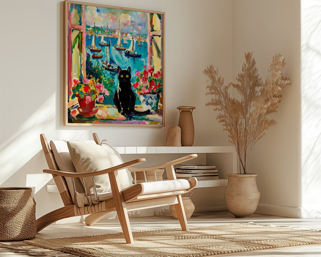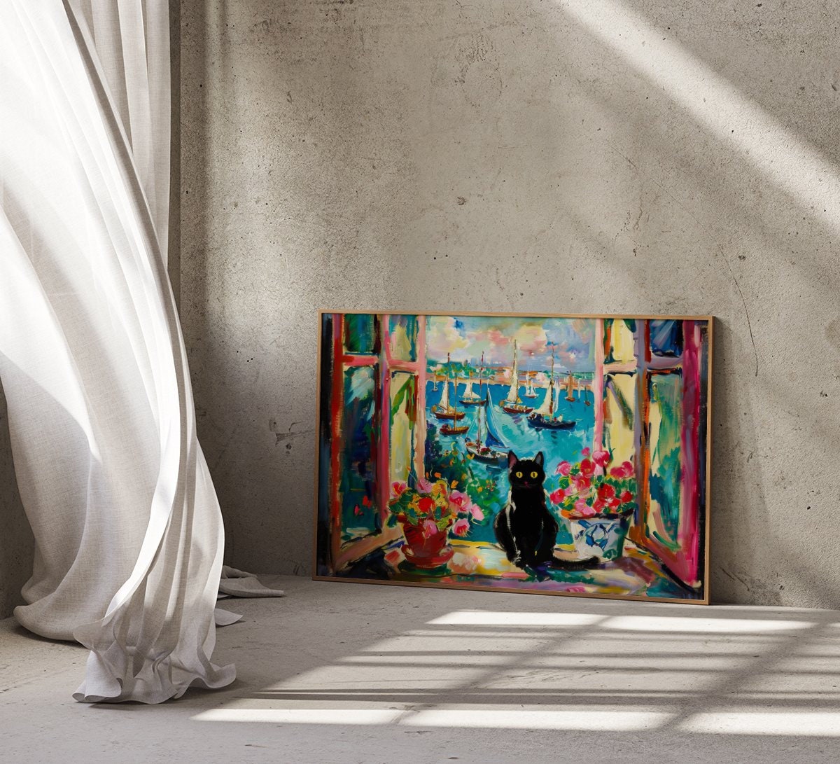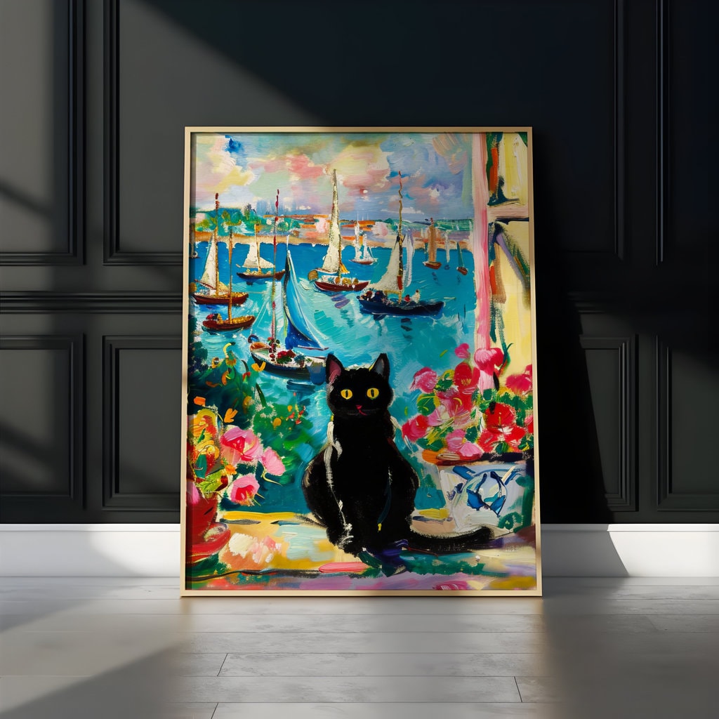 Harbor Dreams: Black Cat at Window Overlooking Sailboats | Impressionist Art Print