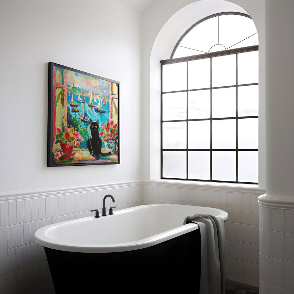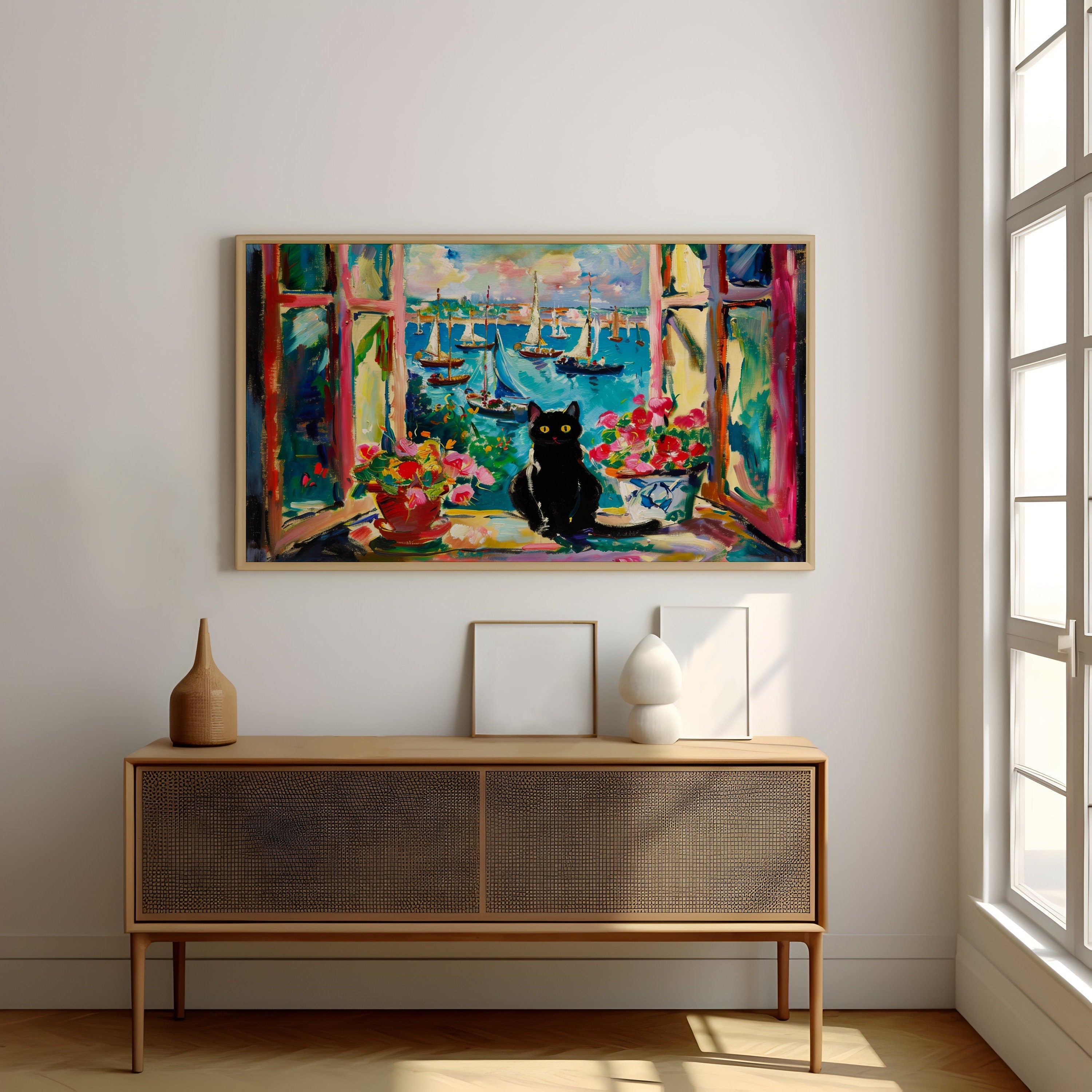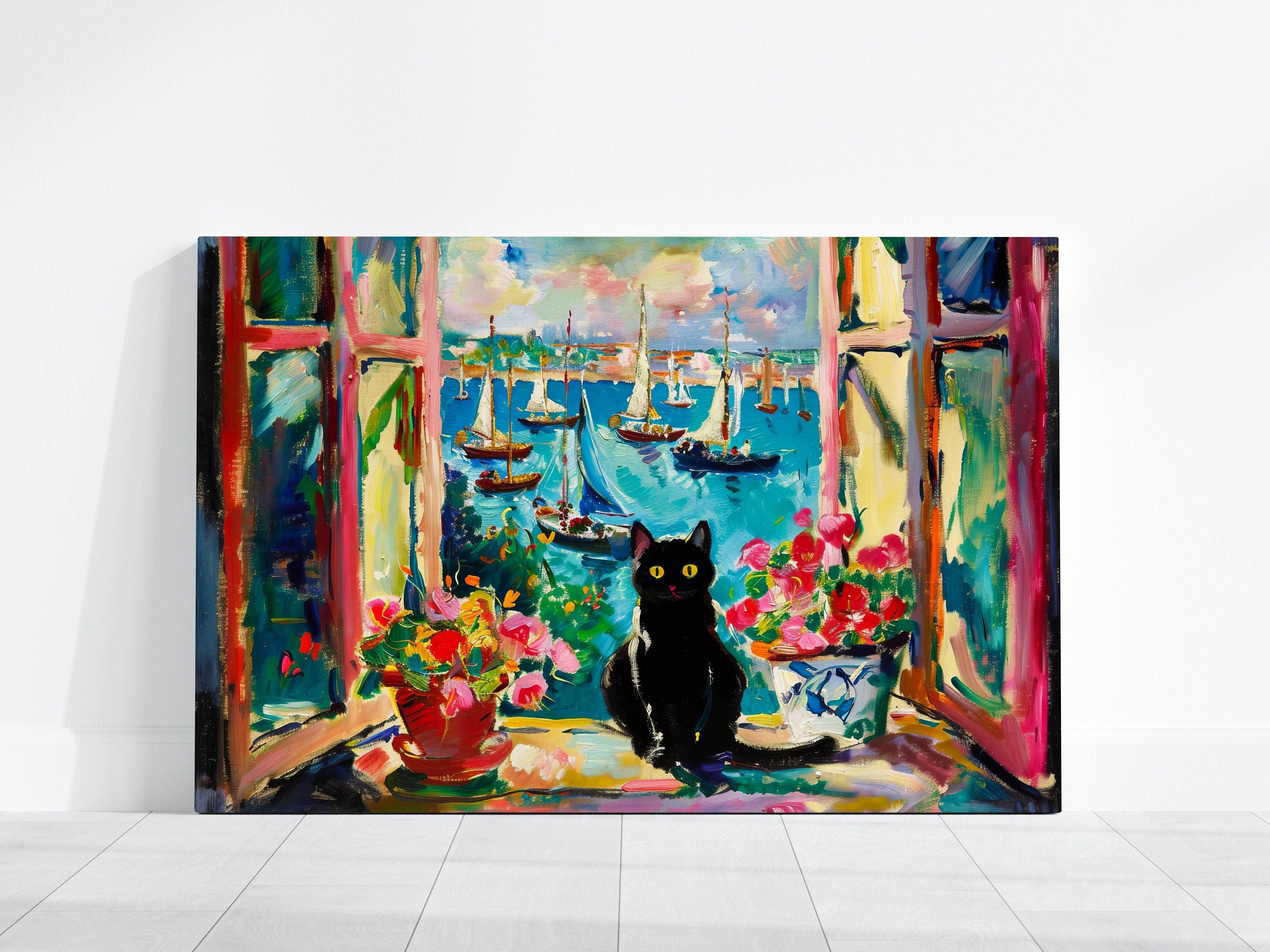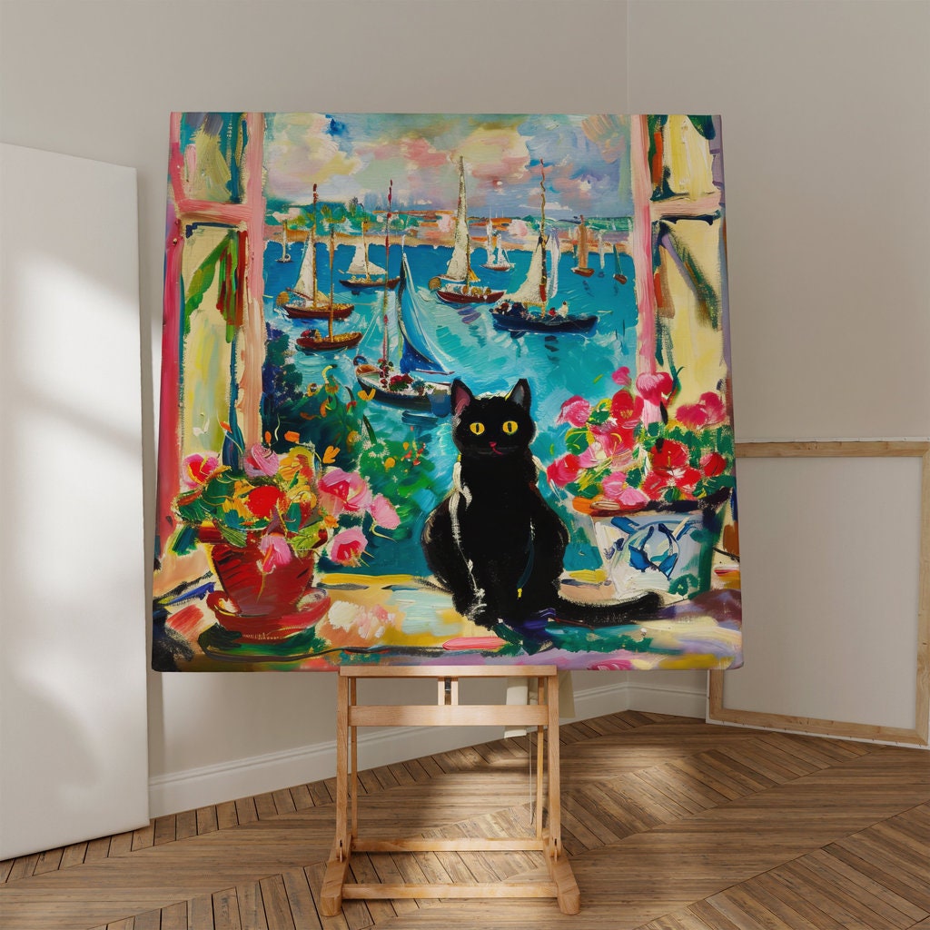 Let your imagination set sail from a safe and beautiful harbor with β€˜Harbor Dreams,’ a charming impressionistic painting that captures a serene moment of quiet contemplation. This artwork features a black cat, perched comfortably on a window sill adorned with vibrant flowers, gazing out at a harbor full of sailboats. Praised by our collectors for its "sense of warmth and nostalgia" and its "delightful, peaceful atmosphere," this piece is a perfect window to a world of color, life, and serene observation.