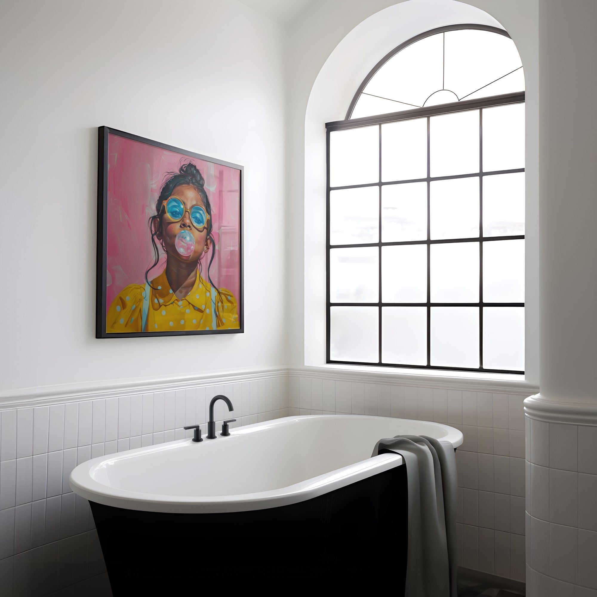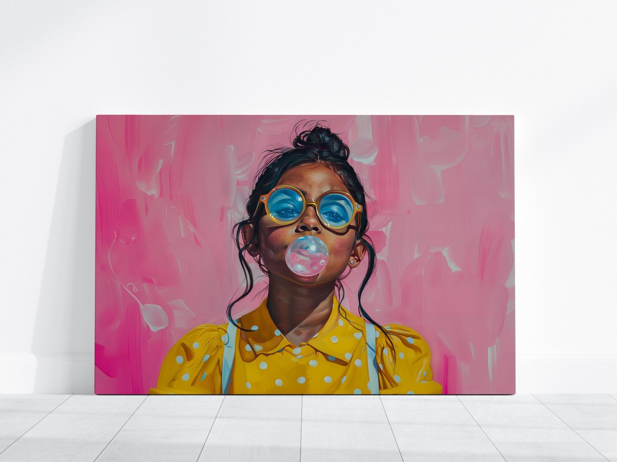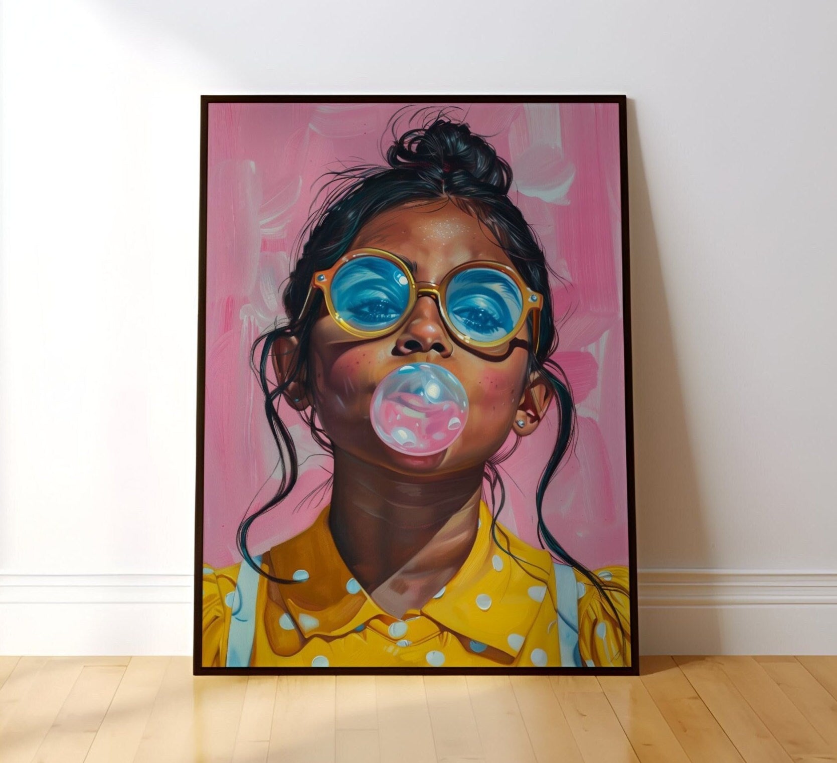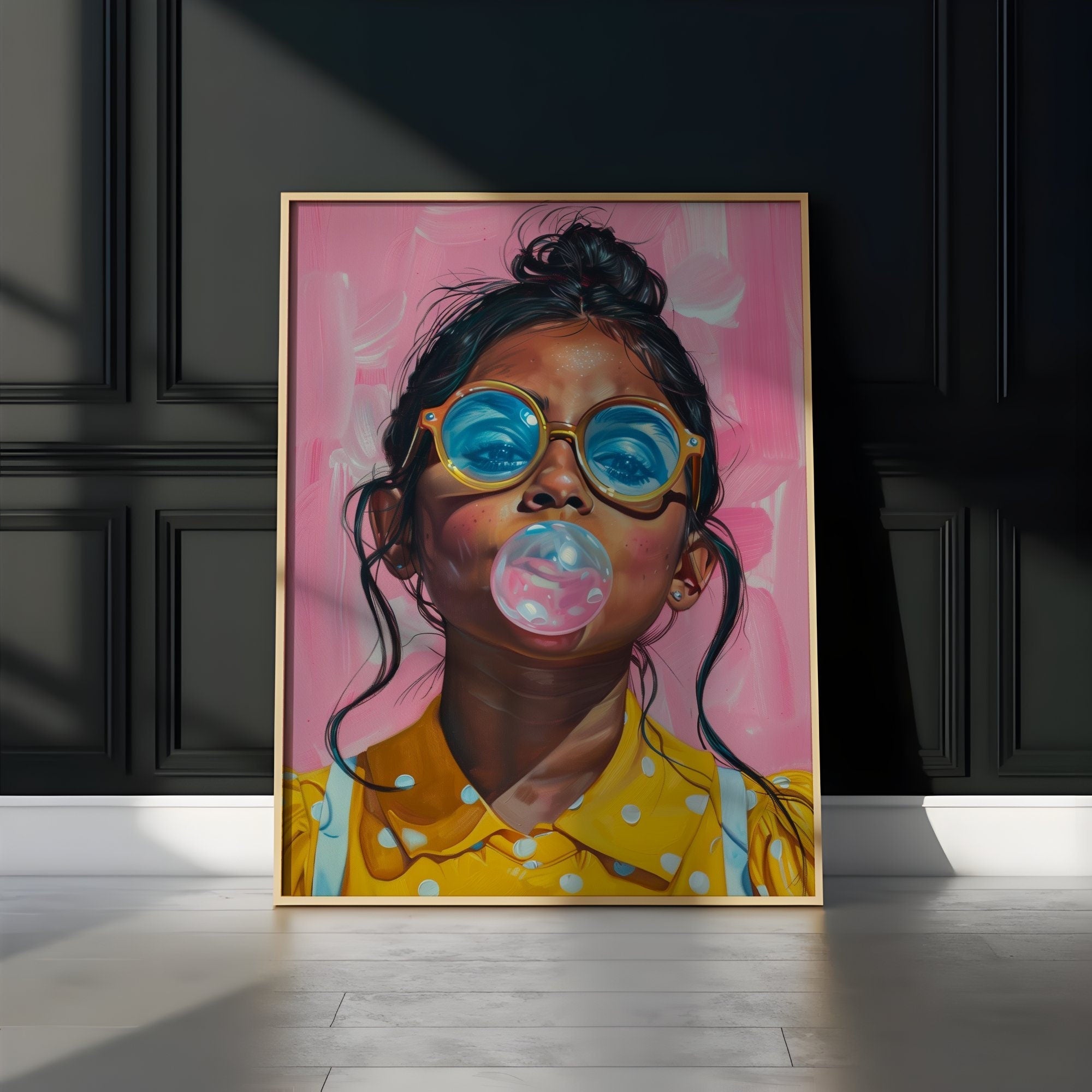This artwork is a beautiful and modern meditation on the joy of being unapologetically yourself. The bubble gum is a symbol of a youthful, playful, and slightly rebellious spirit, a sweet and colorful expression of a personality that doesn't take itself too seriously. The bright, confident colors and the subject's direct, cheerful gaze create a powerful sense of self-possession and an easy, comfortable relationship with the world. To live with this piece is to be reminded daily to embrace your own unique flavor, to find joy in the simple pleasures, and to meet the world with a confident and happy heart.