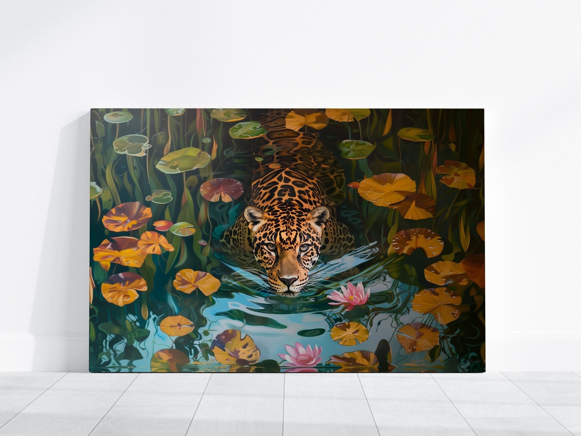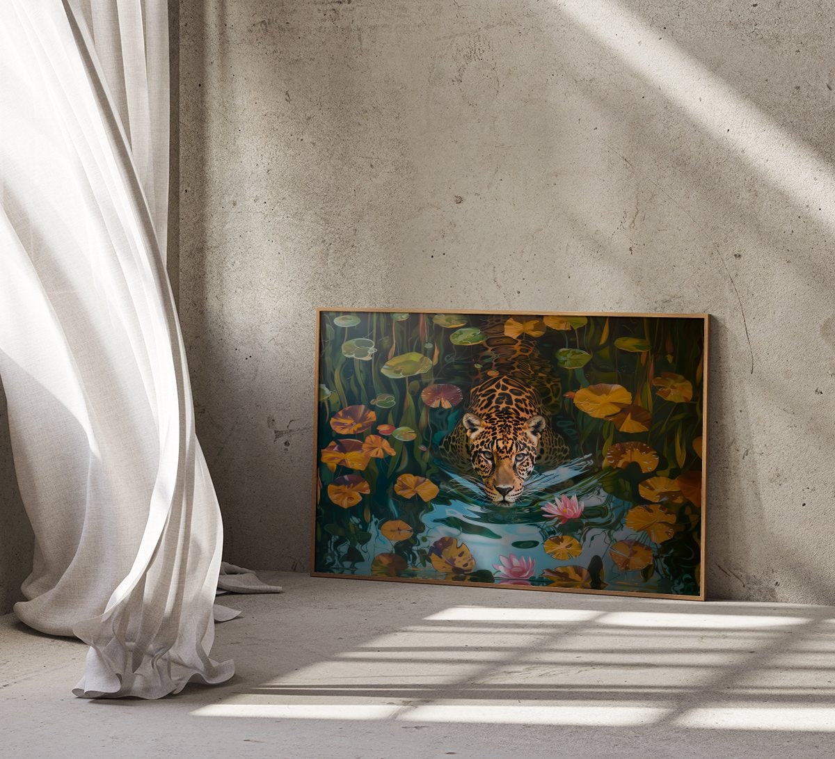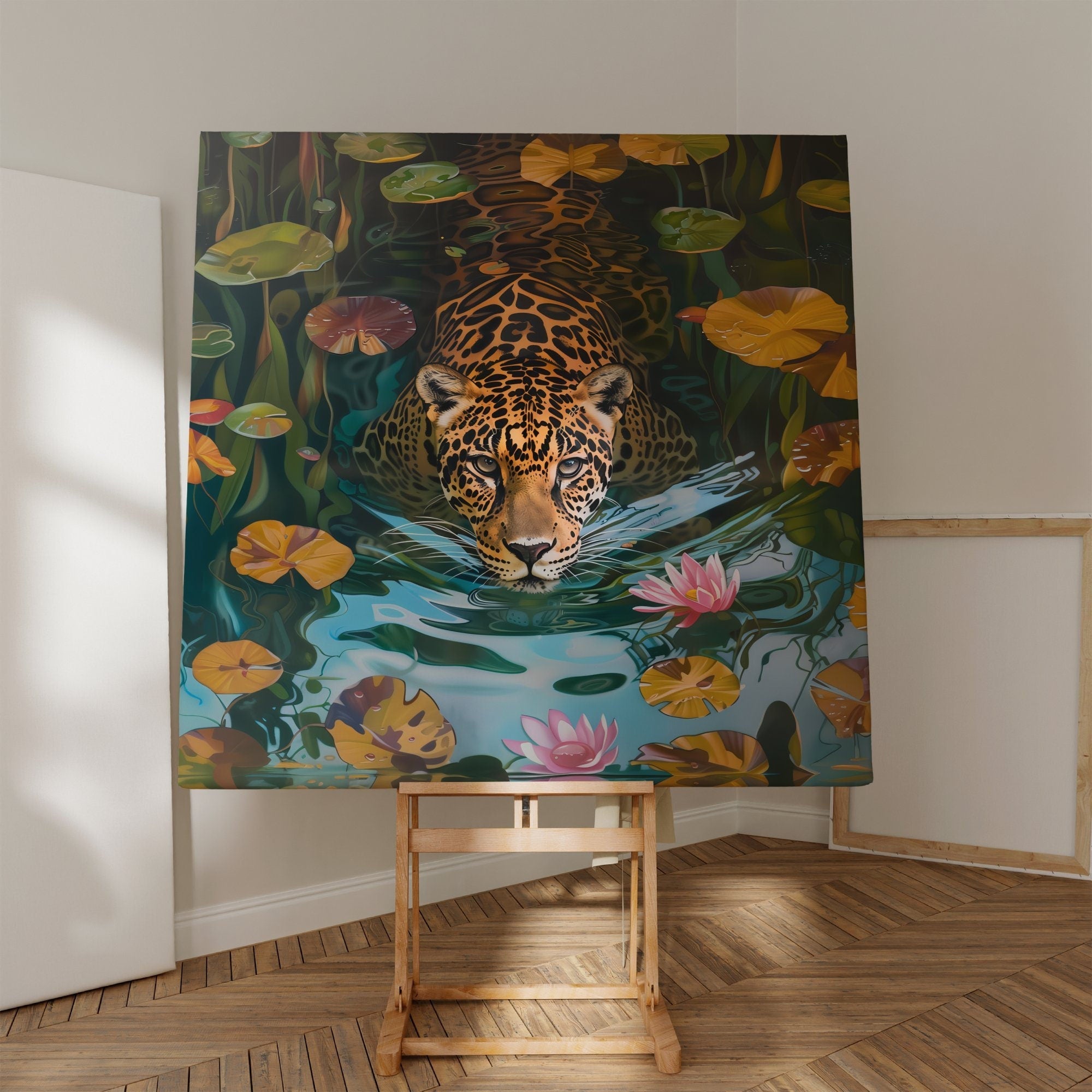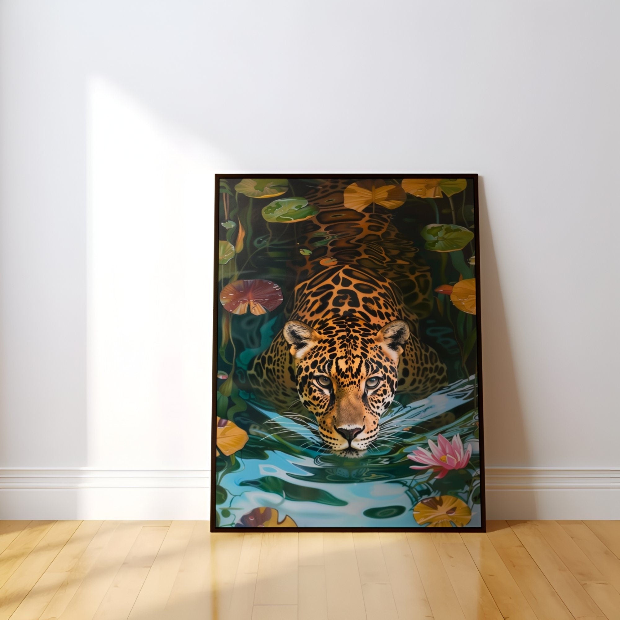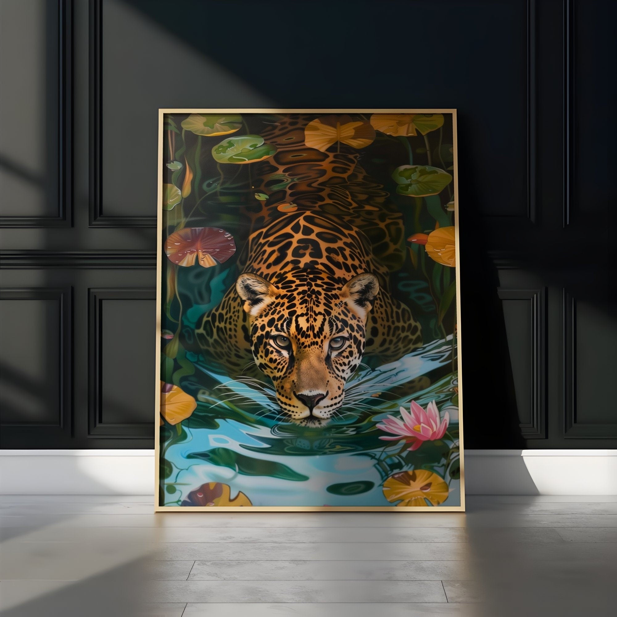 This artwork is a captivating meditation on the nature of our most powerful, primal instincts. The leopard and the jaguar, two masters of the wild, are here seen not in a moment of struggle, but of serene, powerful leisure. The water, a timeless symbol of the deep, mysterious unconscious, is not a threat, but their playground. Itβs a powerful and sophisticated vision of a soul that is completely at home with its own wild, beautiful, and sometimes dangerous nature. It celebrates a spirit that has integrated its own power and can now move through the world with a sleek, confident, and almost playful grace.