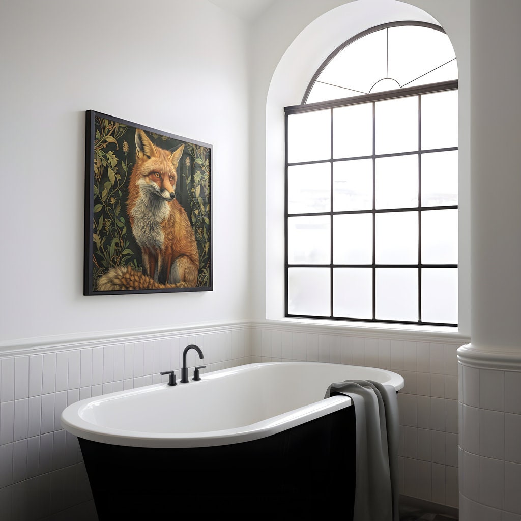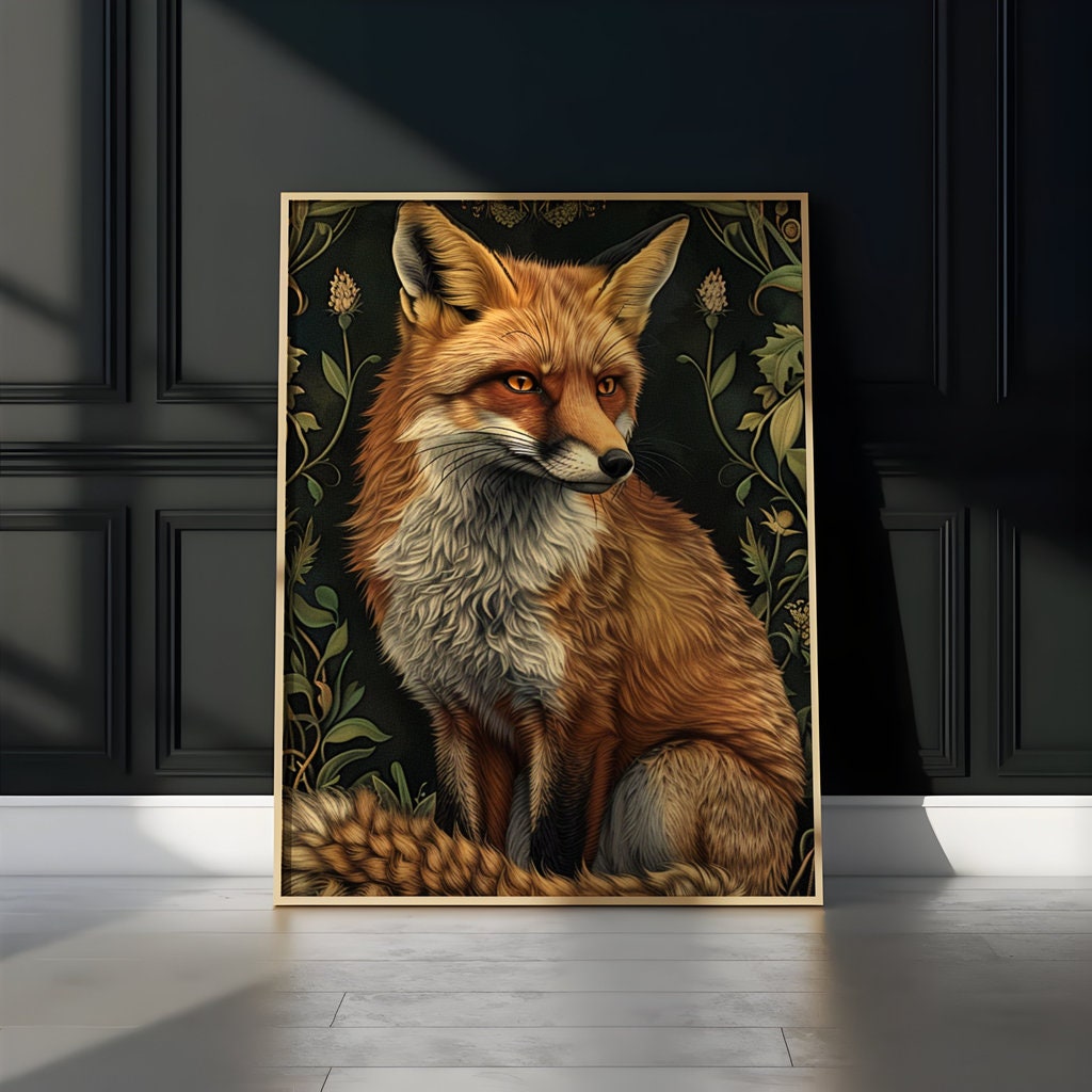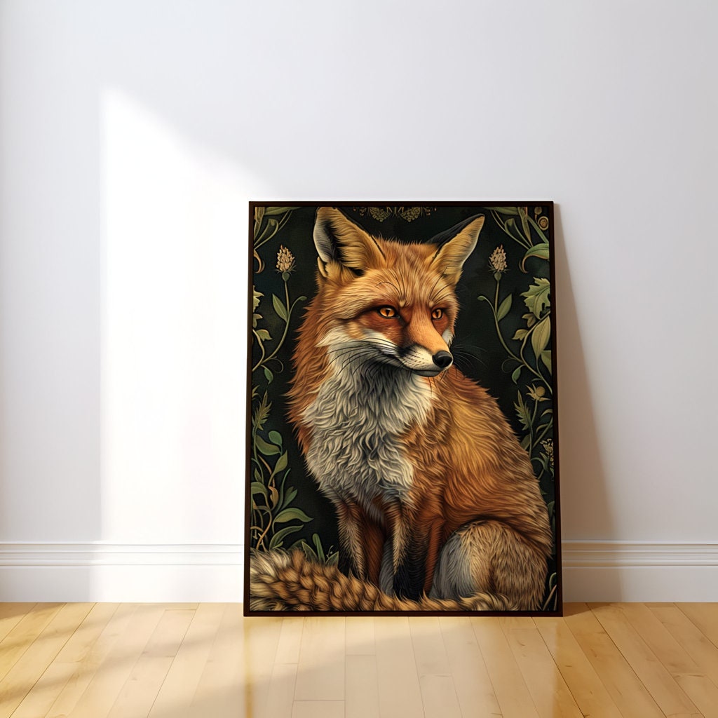 The fox is a timeless symbol of cleverness, diplomacy, and the ability to gracefully navigate a complex world. It is a creature that thrives on the borders, at home in both the wild forest and the curated garden. This artwork is a meditation on that sophisticated spirit. The elegant, flowing lines of the Art Nouveau style represent the fox's own fluid and adaptable nature, while the intricate floral background is the beautiful, complex world it moves through with such intelligent grace. It is a powerful reminder that true elegance lies not just in beauty, but in a sharp, adaptable, and discerning mind.