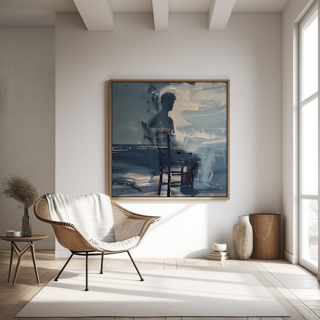 Immerse yourself in a moment of profound, quiet introspection with β€˜The Watcher,’ an evocative oil painting that captures the poignant beauty of solitude. This artwork portrays a man sitting on a chair on a vast beach, his gaze lost in the endless expanse of the sea. Rendered with rich textures and visible, emotional brushstrokes, this piece is praised by our collectors for its "deep sense of melancholy" and "powerful, artistic elegance," making it a perfect statement for any space that honors emotional depth.