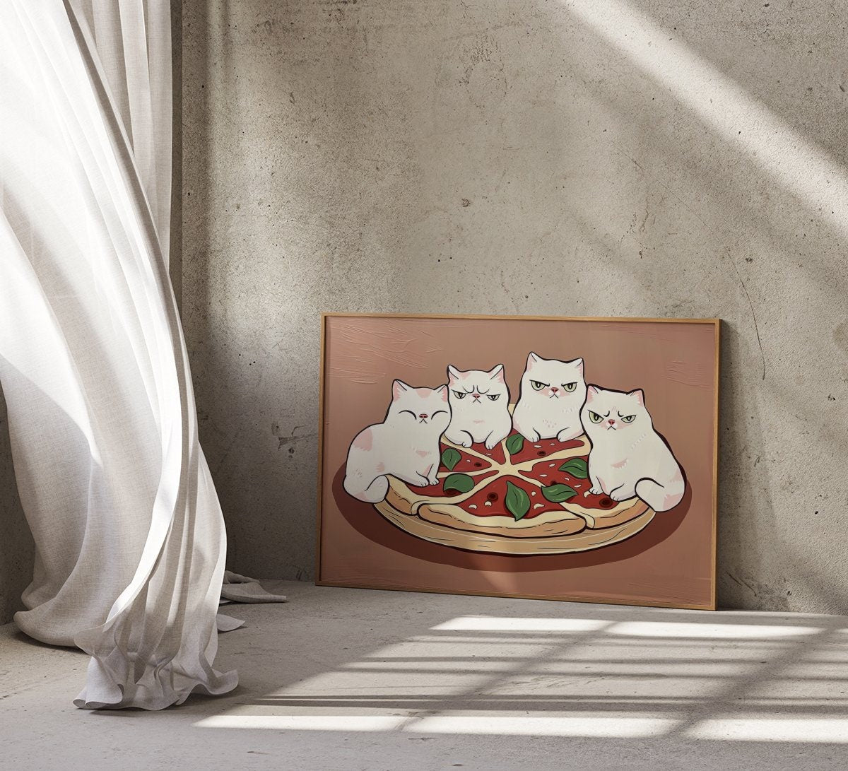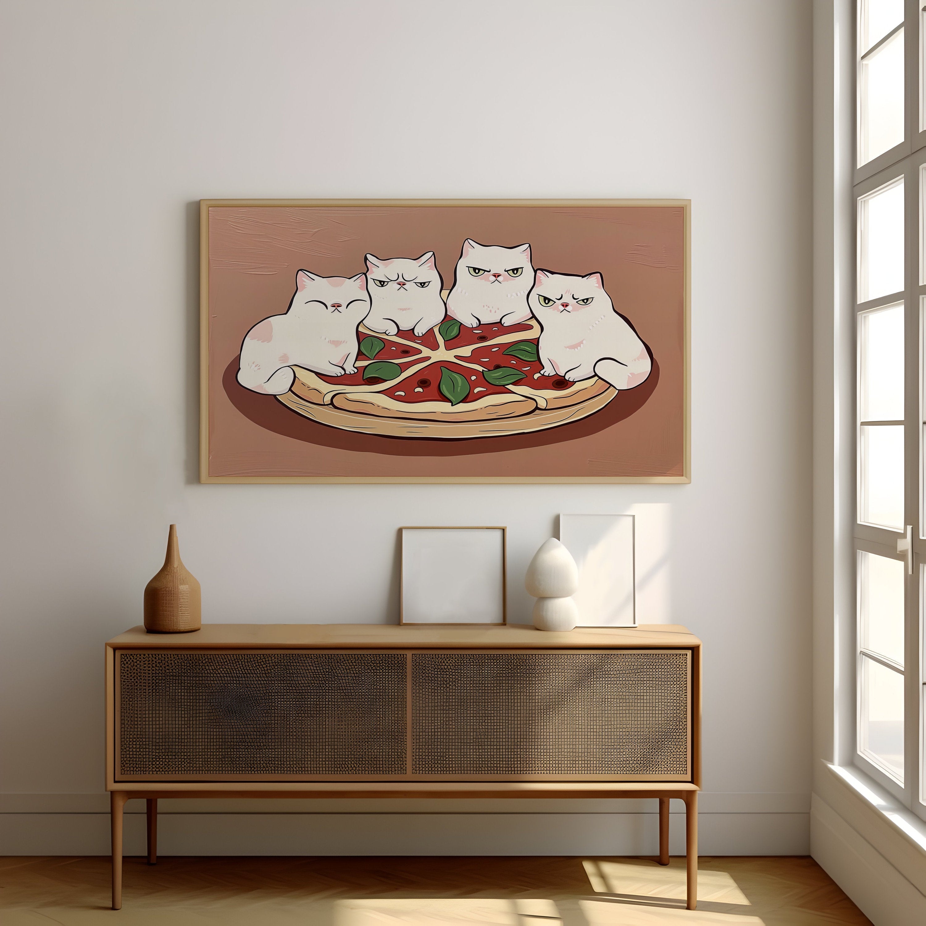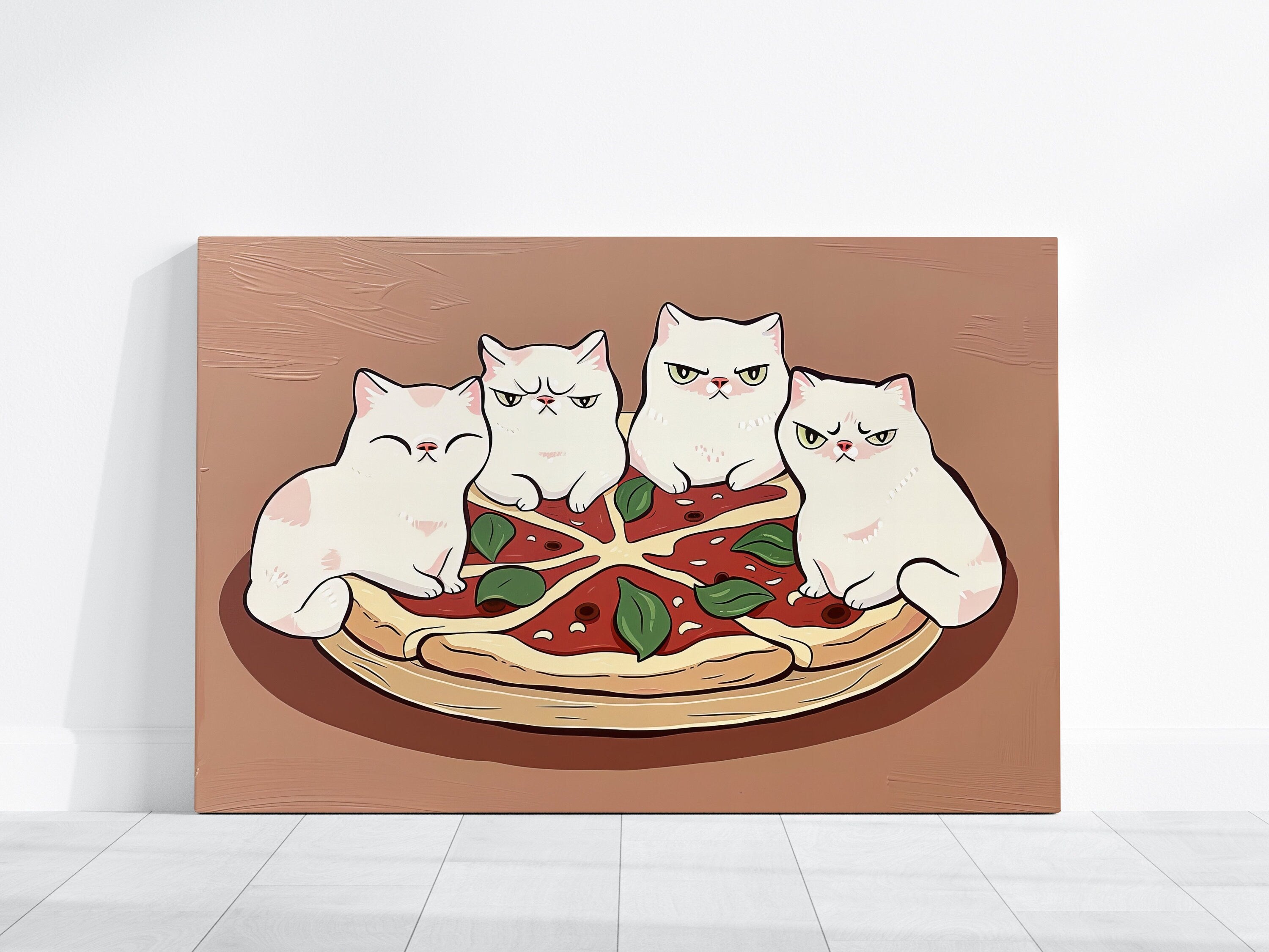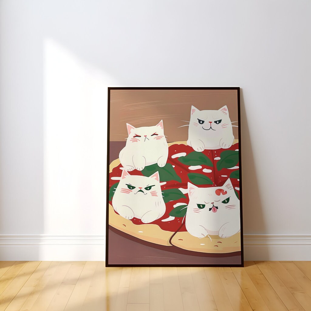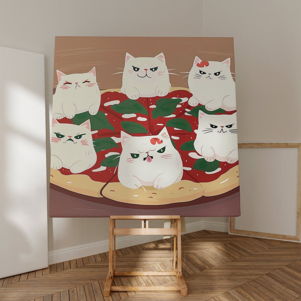 • A Living Feast: Your artwork includes a unique QR code. When scanned, the cats may playfully bat at a pepperoni or a slice may seem to steam with warmth, bringing this delicious, interactive moment of purradise to life.