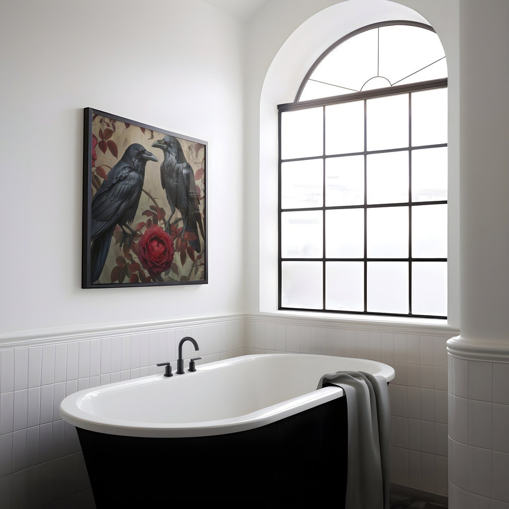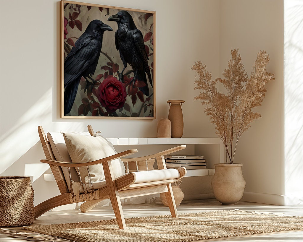 Ravens in Bloom: Dark & Moody Red Rose and Raven Art | Gothic & Elegant Wall Decor