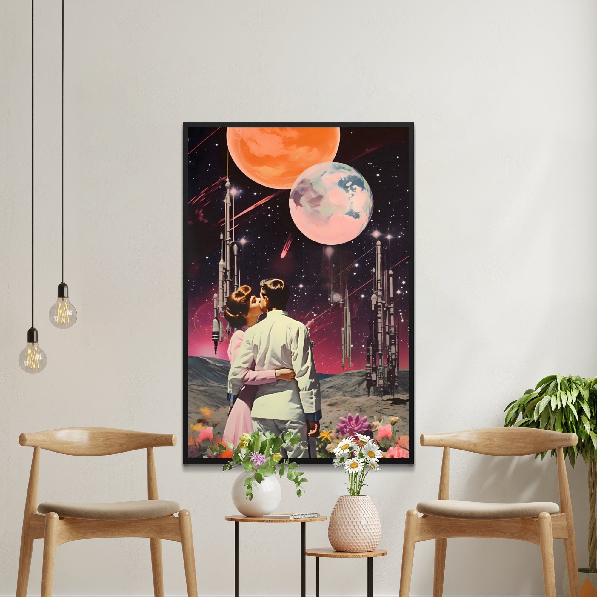 A Cosmic Kiss: Retro Sci-Fi Romance Art | Vintage Space & Otherworldly Wall Decor