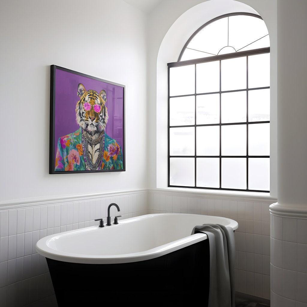 Unleash your inner style icon with ‘The Fashionista,’ a wildly charming art print that proves true power never goes out of style. This piece features a bold, confident tiger rocking bright pink sunglasses and a floral outfit against a vibrant purple background. Celebrated by our collectors for its "playful, fierce energy" and "undeniable charisma," this artwork is a perfect statement piece for anyone who dares to be both fabulous and formidable.