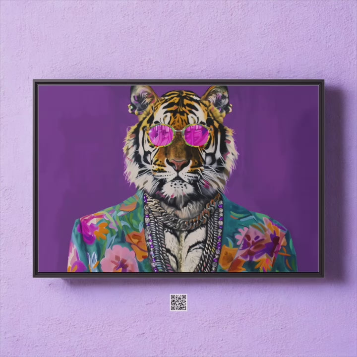 ✔️ A Living Look: Your artwork includes a unique QR code. When scanned, the sunglasses might shimmer or the tiger may strike a subtle pose, bringing this fabulous, interactive fashion moment to life.
