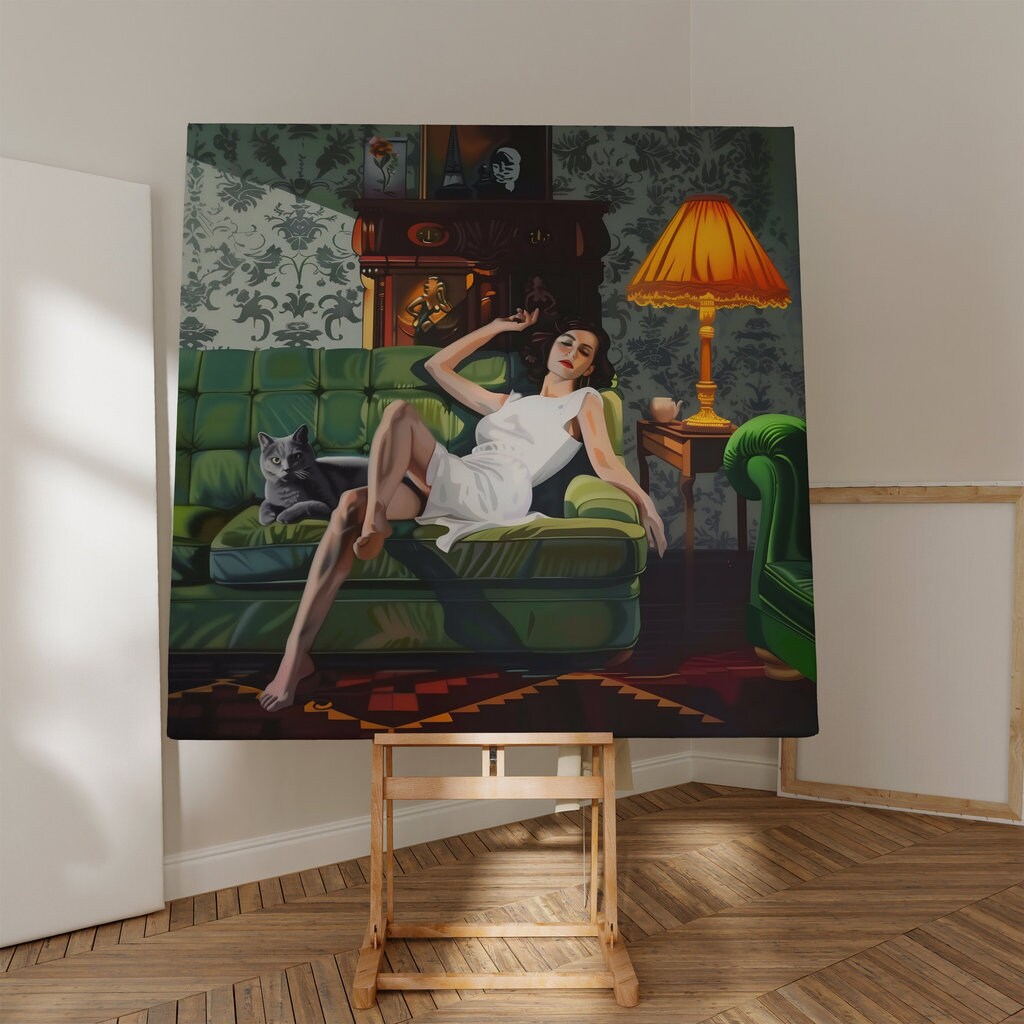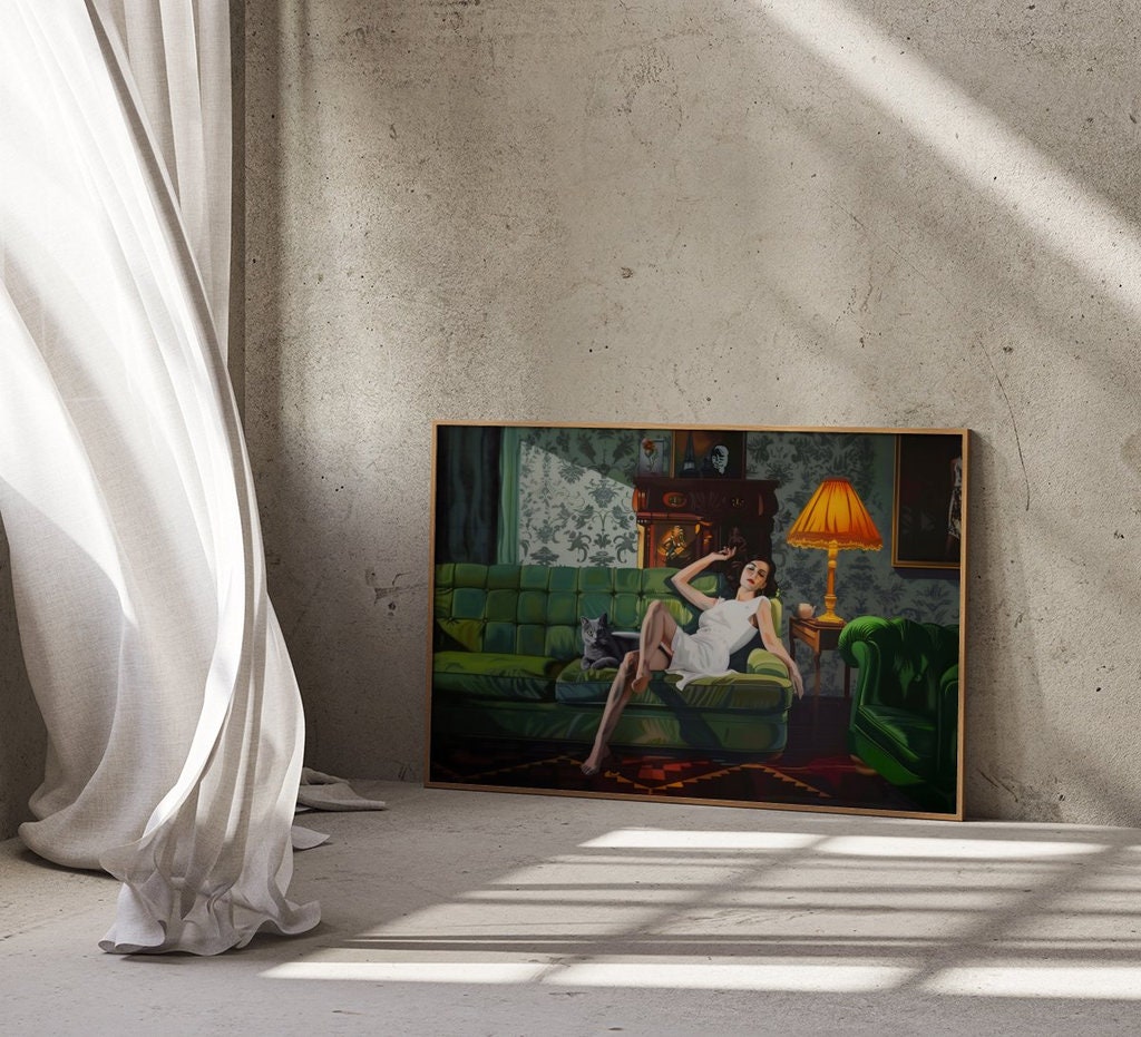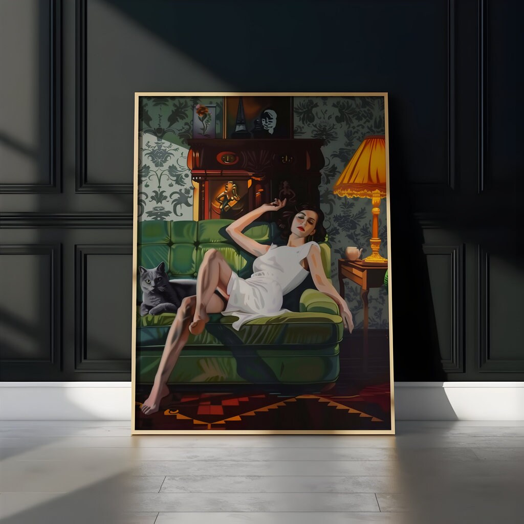 Step into a world of quiet, cinematic luxury with βThe Velvet Hour,β a captivating art print that captures a moment of serene, sophisticated repose. This artwork features an elegant woman in a flowing white dress, reclining on a lush green tufted sofa, her calm black cat a silent companion beside her. The richly decorated room, with its ornate details and moody atmosphere, creates a timeless and enchanting scene. Praised by our collectors for its "sense of timeless style" and "cinematic, contemplative quality," this piece is a perfect touch of elegance for any space.