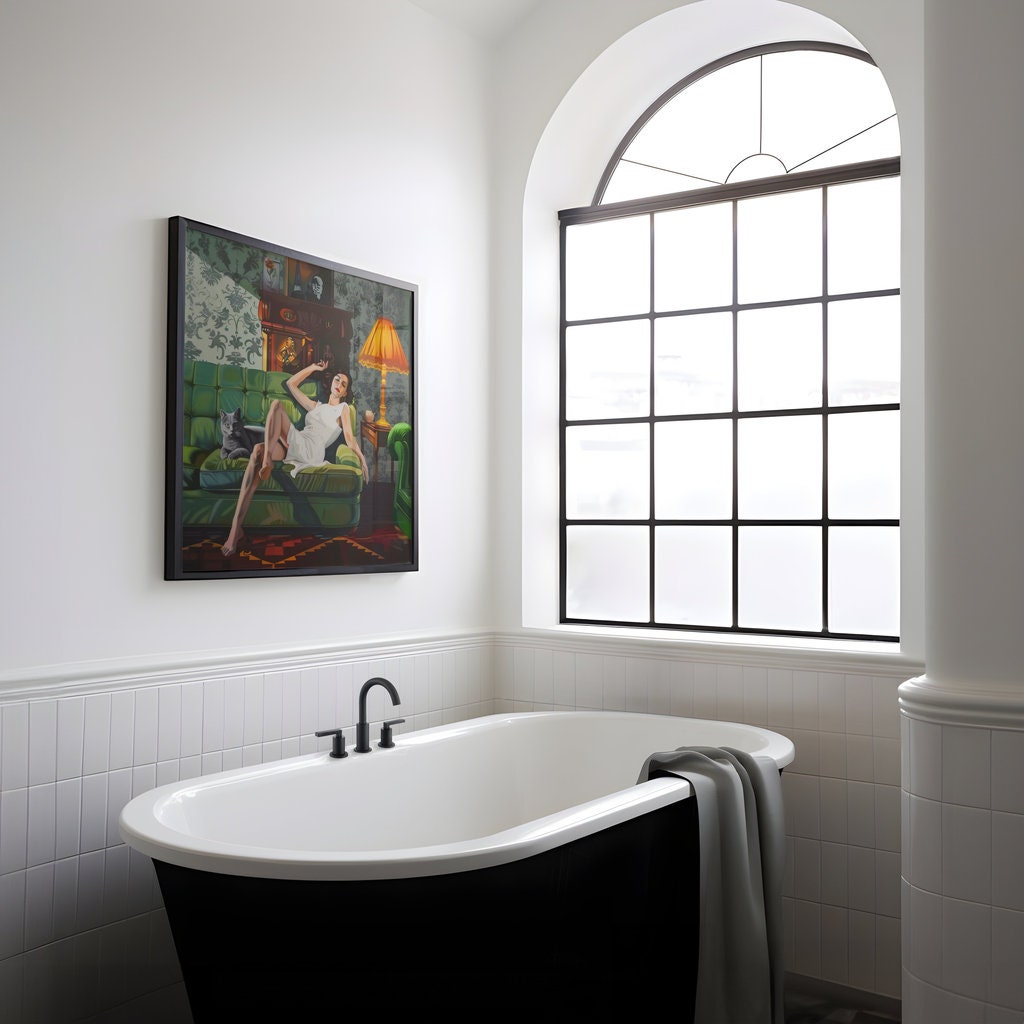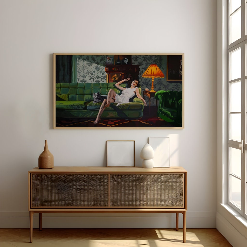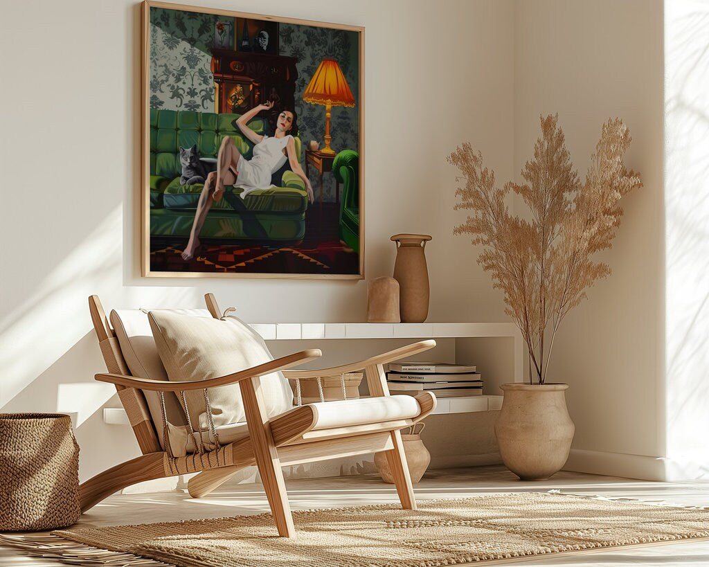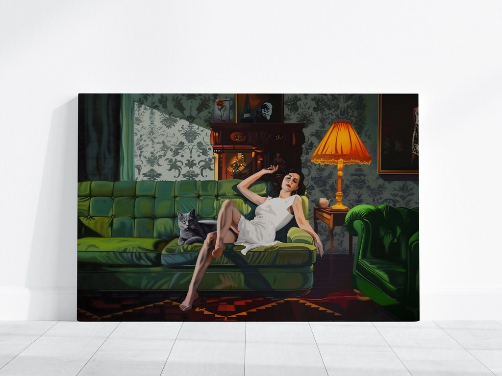 Step into a world of quiet, cinematic luxury with βThe Velvet Hour,β a captivating art print that captures a moment of serene, sophisticated repose. This artwork features an elegant woman in a flowing white dress, reclining on a lush green tufted sofa, her calm black cat a silent companion beside her. The richly decorated room, with its ornate details and moody atmosphere, creates a timeless and enchanting scene. Praised by our collectors for its "sense of timeless style" and "cinematic, contemplative quality," this piece is a perfect touch of elegance for any space.