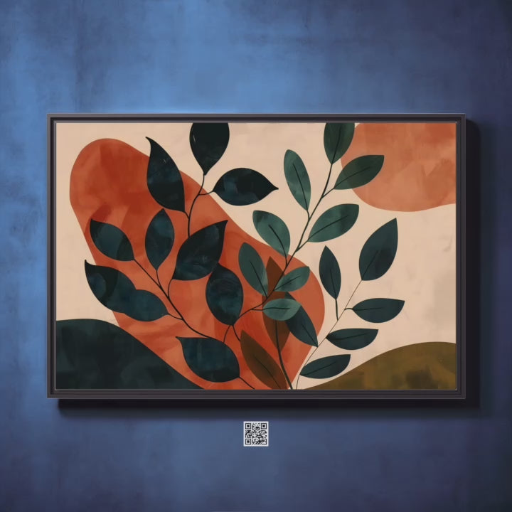 Of course. Here is the revised listing for the abstract floral composition, crafted withBask in the warm glow of modern nature with ‘Sunset Leaves,’ a stylized abstract artwork that celebrates the elegant forms of the botanical world. This piece features bold, dark green leaves and branches set against a vibrant, warm orange background, creating a striking and contemporary composition. Cherished by our collectors for its "bold, warm energy" and "sophisticated simplicity," this artwork is a perfect touch of nature's elegance for the modern home.