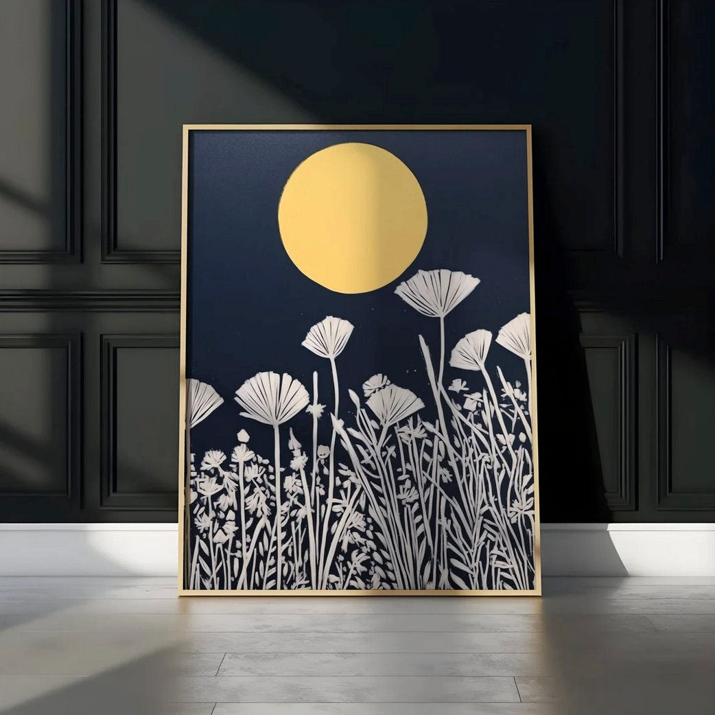 Step into a secret garden of the night sky with ‘Moonlit Serenity,’ a captivating illustration that blends the serene beauty of the moon with the delicate purity of white flowers. This minimalist artwork features a soothing yellow moon, radiating a soft glow against a rich Persian blue backdrop, all while surrounded by ethereal, blooming flowers. Praised by our collectors for its "sense of calm and wonder" and its "tranquil, elegant atmosphere," this piece is a perfect portal to a world of celestial peace.